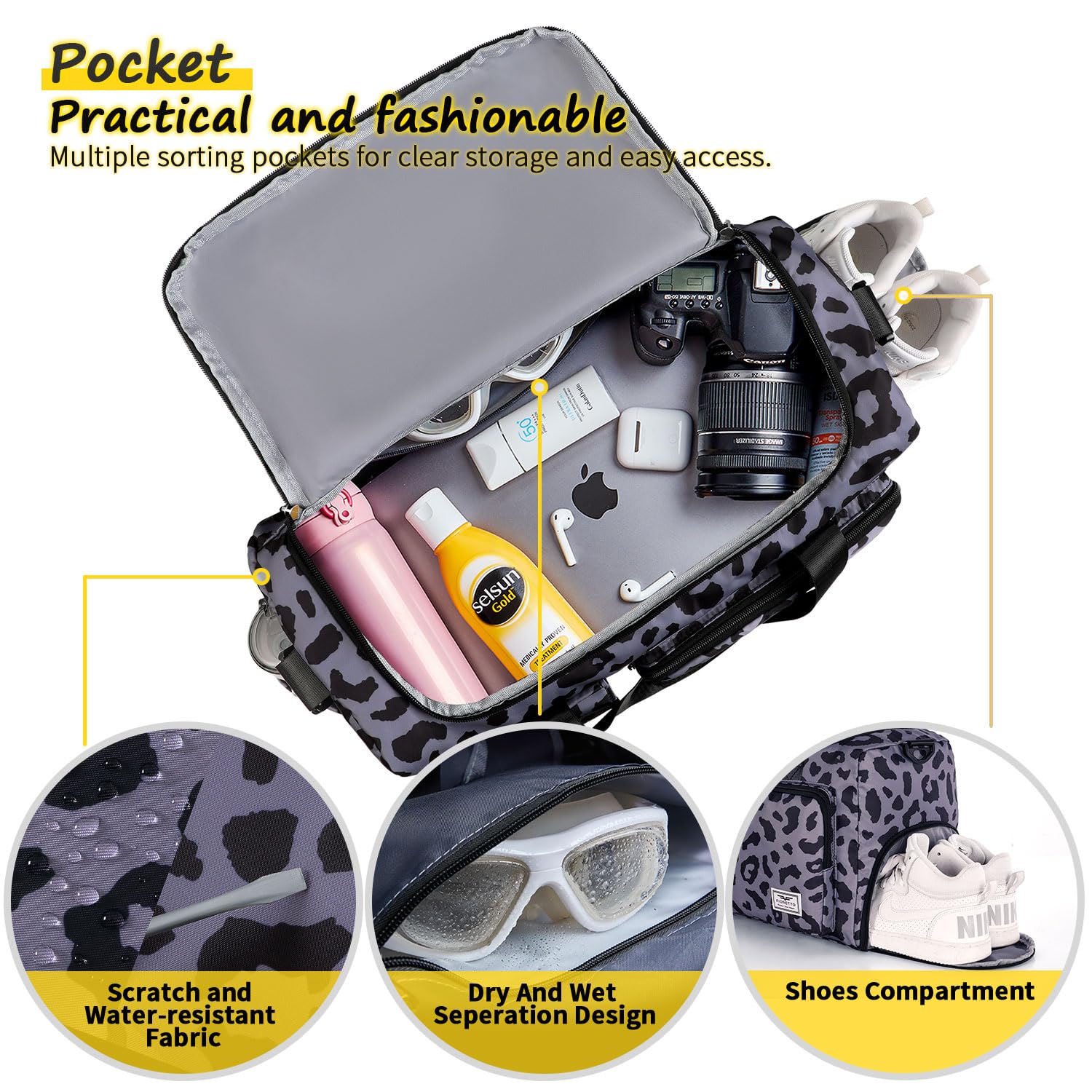 FIORETTO Women's Water-Resistant Gym Duffle Bag with Shoes Compartment, 37L Capacity, Multi-Functional, Ideal for Travel, Gym, Sports, Duffel, Weekender, Leopard Print