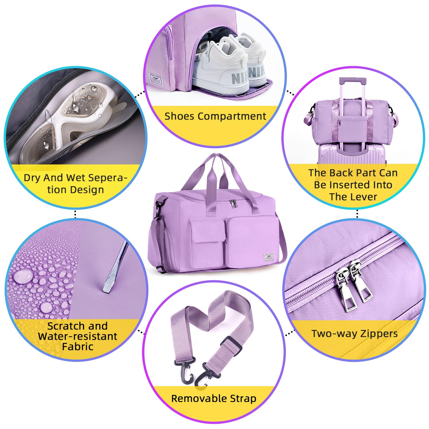 - Dry & Wet Separated: The sports bag has a waterproof wet pocket in the main compartment which can contain your wet towels. In additon, equipped with a shoe compartment, it can keep dirty shoes away from clean clothes
