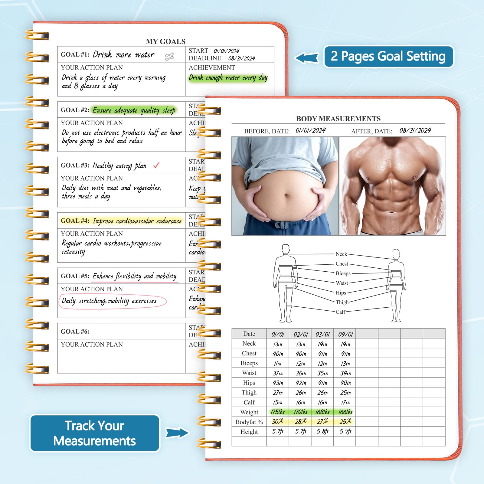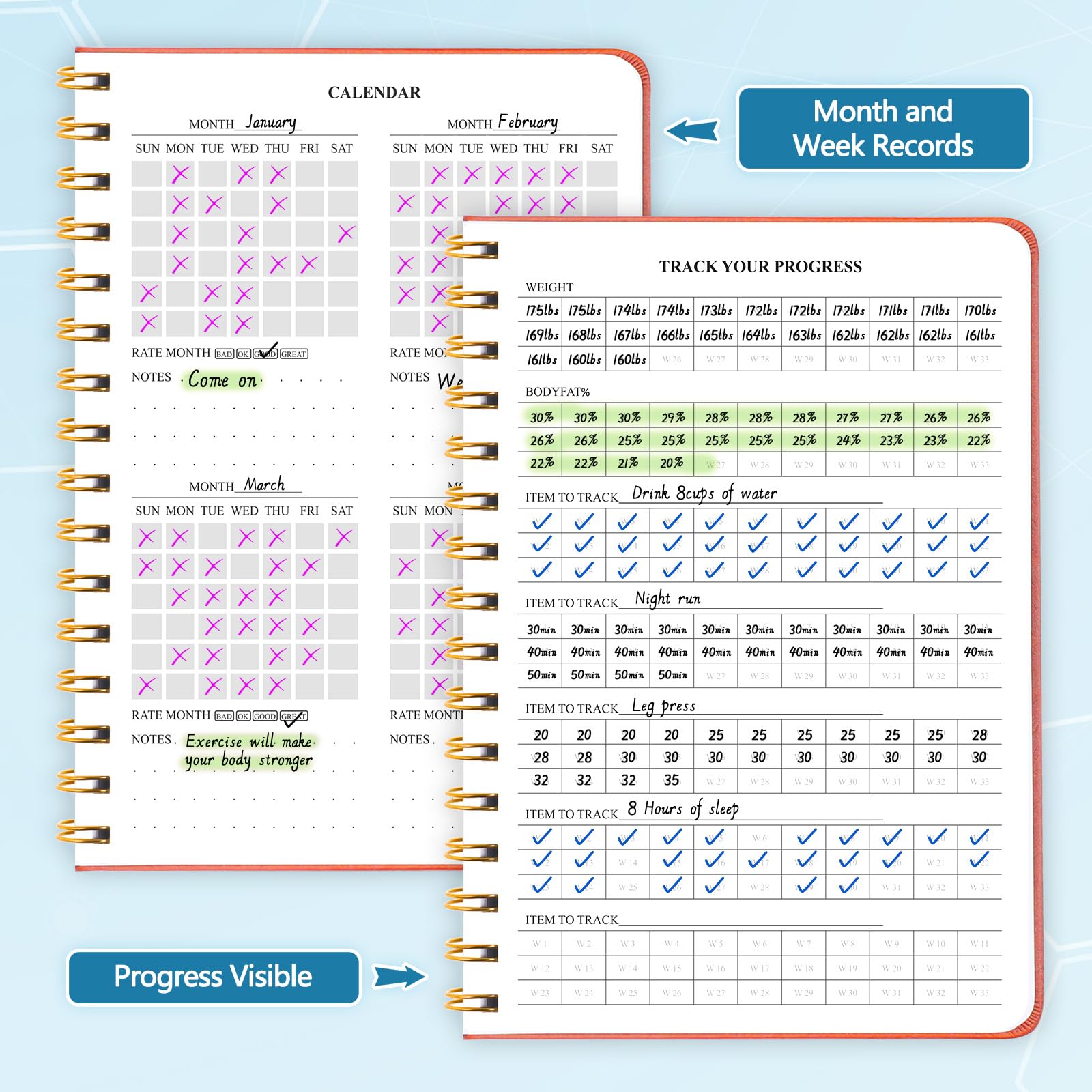 - Set Fitness Goals - Fitness journal with up to 12 goals, 8-month calendar tracks exercise frequency for organized fitness journey.