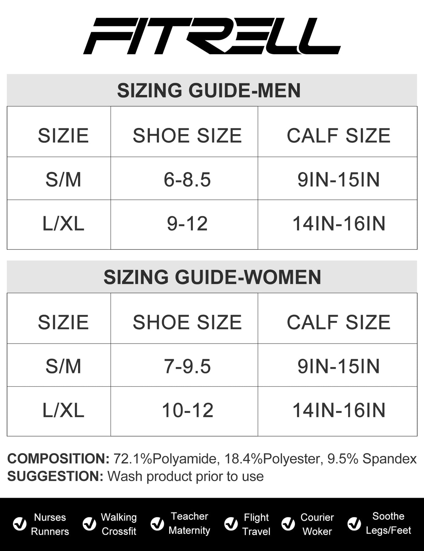 - ★★★Size Tips: Choose according to your CALF size first as for 20-30 mmHg. One size smaller if need tighter compressions. S/M fit for Calf size 9-15in, mens US shoes 6-8.5, womens US shoes 7-9.5; L/XL fit for Calf size 14-16in, mens US shoes 9-12, womens US shoes 10-12.