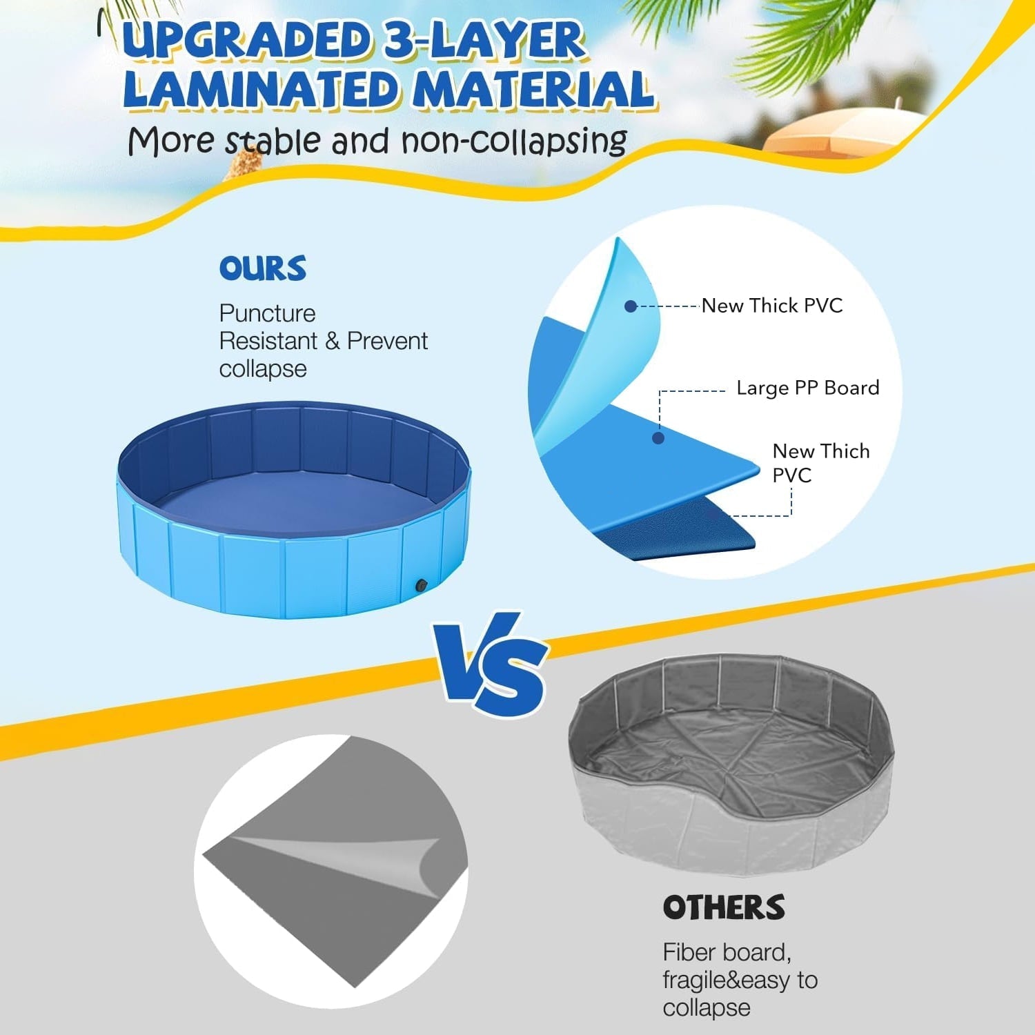 • 【Premium Materials, Upgraded Stability】Made of exterior extra-tough waterproof PVC, and interior sturdy rectangular PP boards, ensuring that the pet pool is not prone to toppling over and is wear-resistant for long-time use;