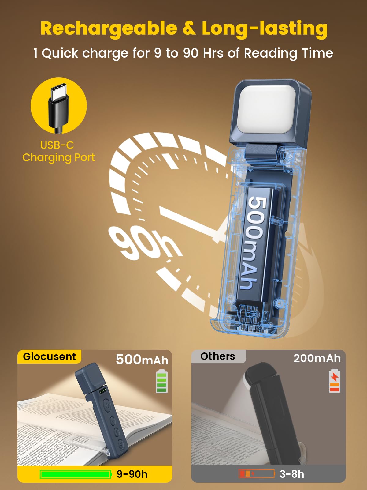 - [Rechargeable & Long-lasting] This rechargeable book light is charged by the fast & safe USB-C cable and is compatible with any USB port on your computer, adapter, or USB outlet. This light has a built-in 500mAh battery providing 10–90 reading hours of reading time (depending on your brightness setting). So you can enjoy reading for up to 3 months if you read 30-min daily. 4 battery indicators ensure no worries about the light suddenly powering off. An amazing powerful rechargeable book light.