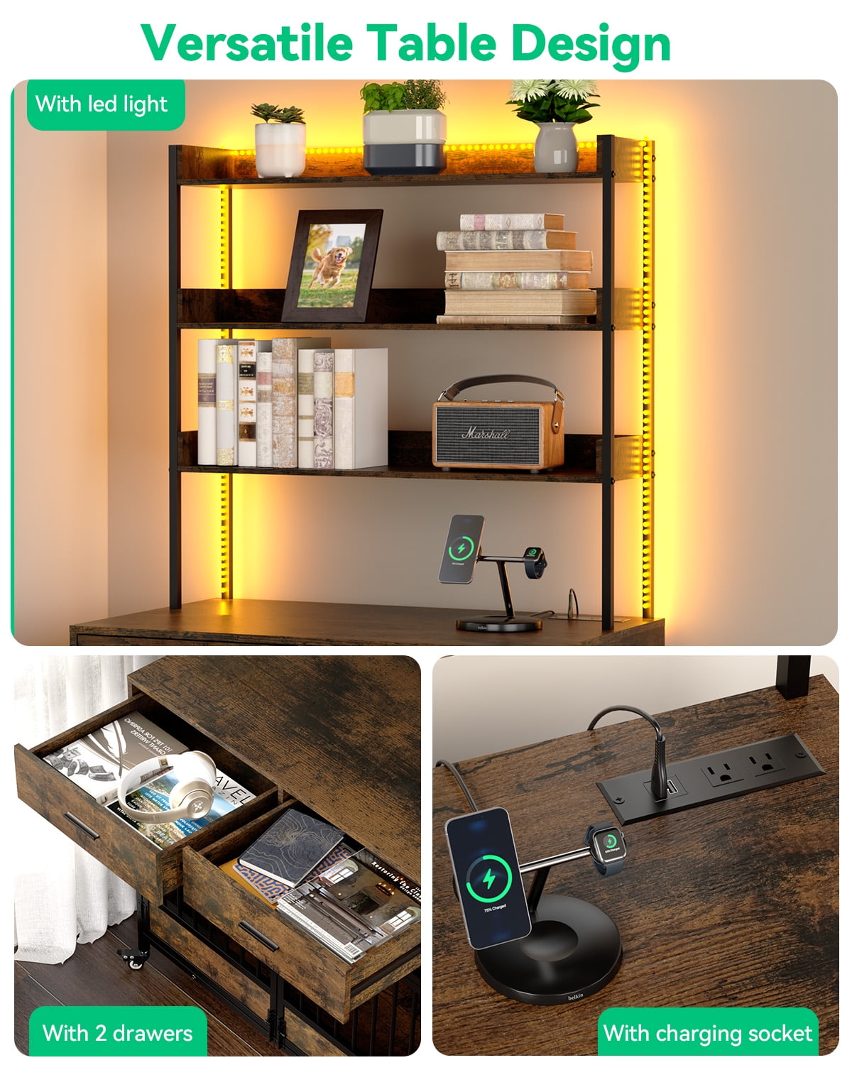 Behost® Industrial Rustic Large Dog Crate with 3-Tier Shelves, Power Outlet, LED Light, and Wheels — Modern Furniture-Style Crate for Large Dogs with Extra Storage & Functionality