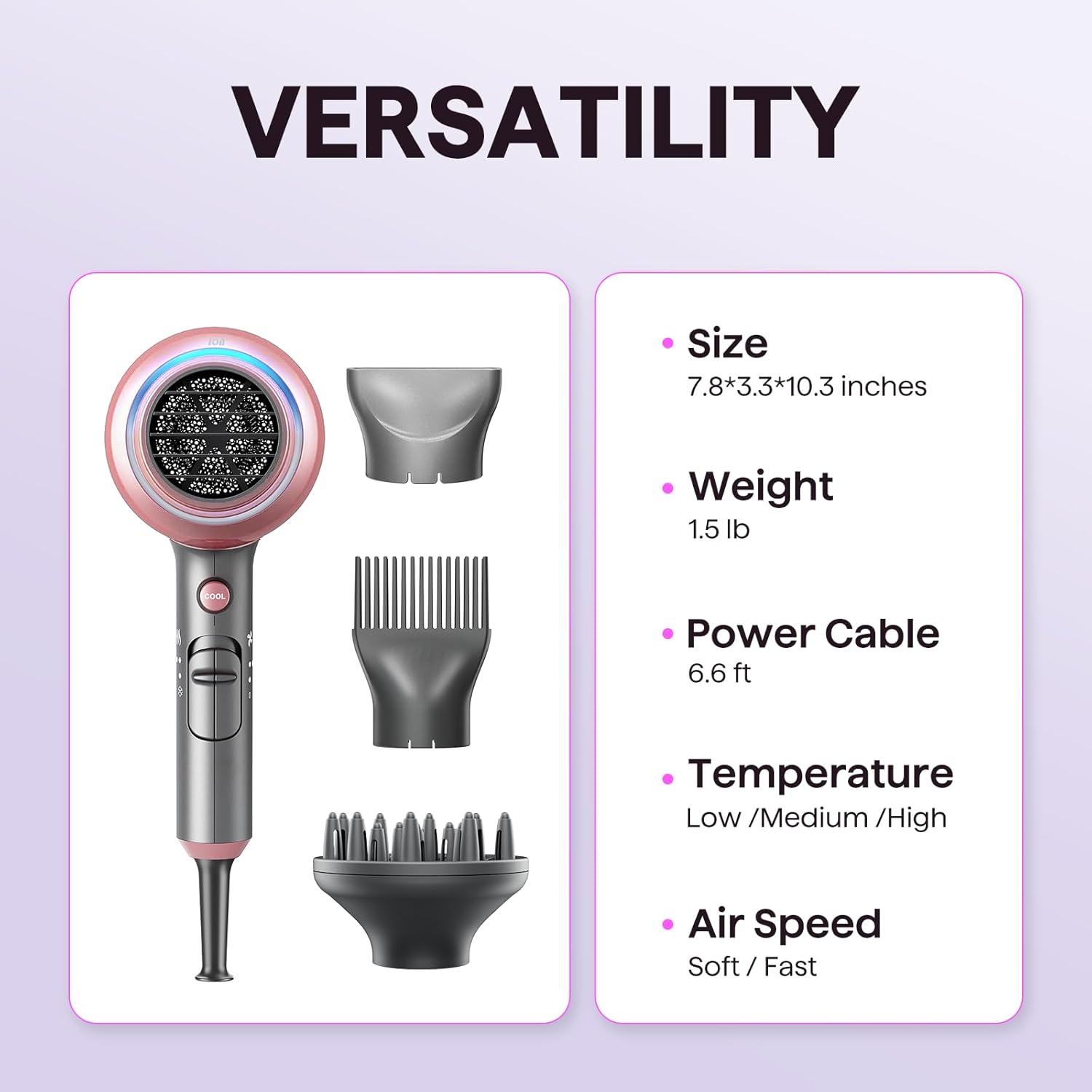 • 2x Faster Drying: Powered by a robust 1875W motor and advanced aerodynamic design, this ionic hair dryer delivers high-speed airflow to dry your hair twice as fast. Spend less time drying, avoid overheating, and minimize damage—all while achieving effortlessly sleek results.