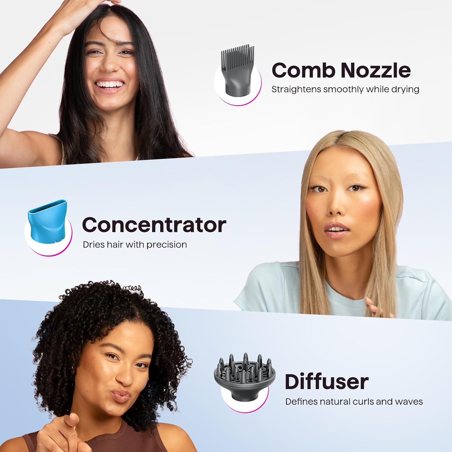 • 3 Attachments for Every Style: A concentrated nozzle delivers precision airflow, allowing for targeted styling and greater control. The diffuser reduces frizz while enhancing and defining natural curls or waves. The comb attachment smooths and straightens, making it perfect for managing thick, unruly hair with ease.