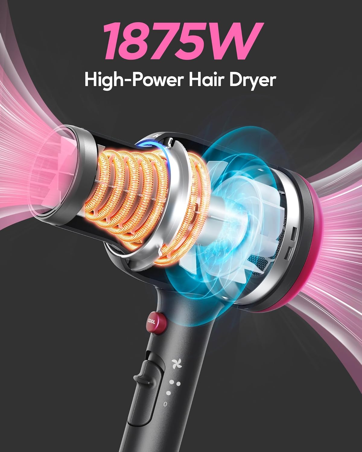 - 2x Faster Drying: Powered by a robust 1875W motor and advanced aerodynamic design, this ionic hair dryer delivers high-speed airflow to dry your hair twice as fast. Spend less time drying, avoid overheating, and minimize damage—all while achieving effortlessly sleek results.