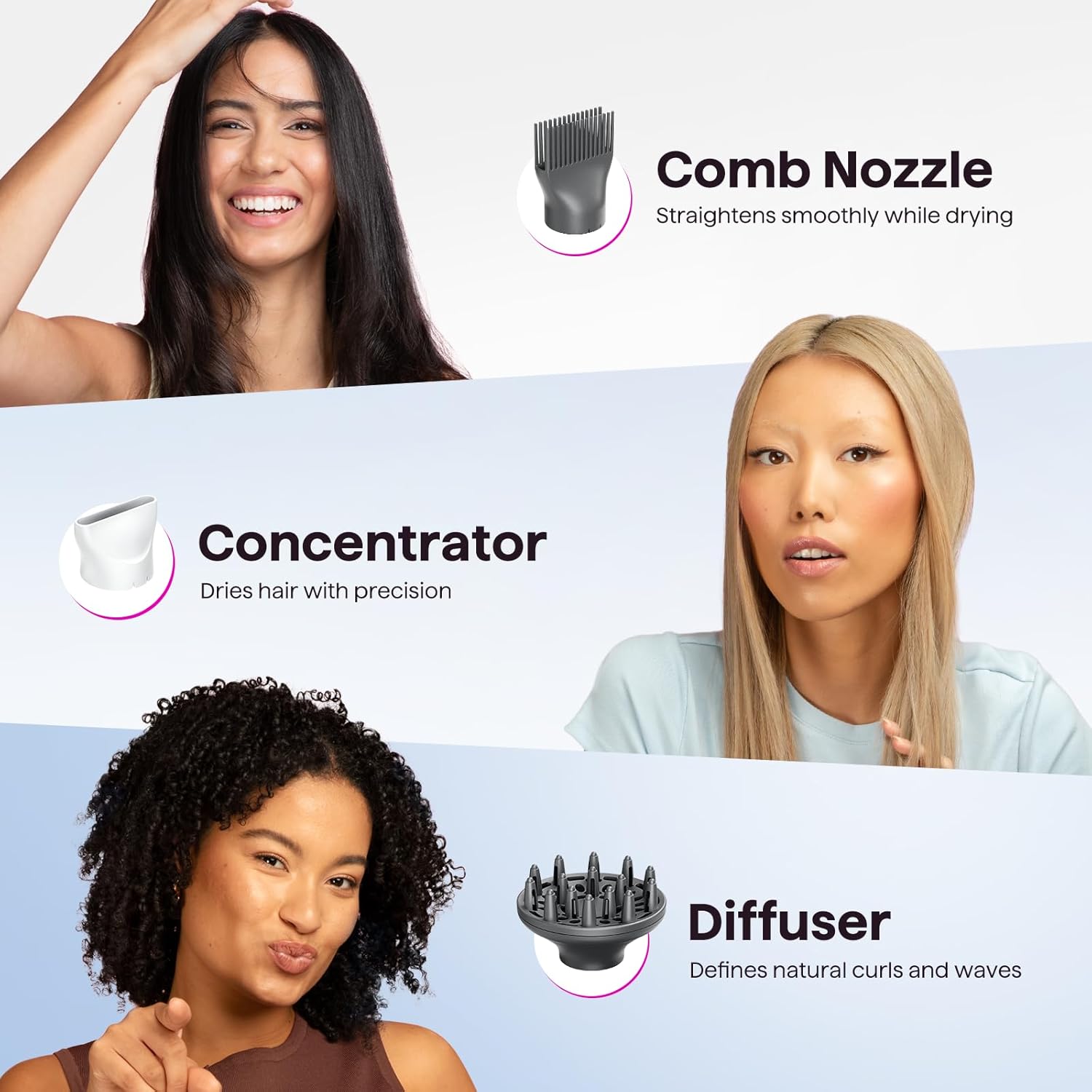 - 3 Attachments for Every Style: A concentrated nozzle delivers precision airflow, allowing for targeted styling and greater control. The diffuser reduces frizz while enhancing and defining natural curls or waves. The comb attachment smooths and straightens, making it perfect for managing thick, unruly hair with ease.