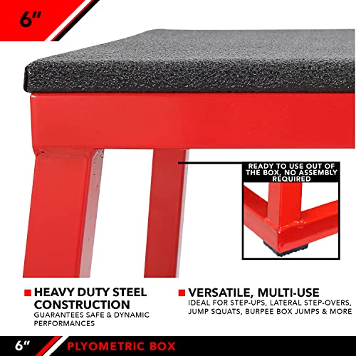 Details: Jump into your next workout! Convenient 6β plyo box with no assembly required will help you reach those training goals. Indestructible heavy-duty steel construction design, with solid rubber non-slip mat, and non-slip rubber pads on all 4 corners guarantees safe and dynamic workouts for years to come. Excellent for both men and women, the slip free landing pad with fully wrapped and tucked corners, this plyo box provides optimum safety and is guaranteed not curl up after many uses. Excellent for plyometric and speed drills, improve shoulders, arms, chest, glutes, and legs while strengthening and improving overall core stability and body tone. Develop that explosiveness you have wanted and build proficiency with every box jump, agility, and stamina workout. All our premium JFIT jump platforms are tapered to ensure greater stability and ease in jumping with a lightweight, stackable space saving design. Arrives fully assembled, 6' Plyo Box measures 11x11β top platform and 13x13β base.