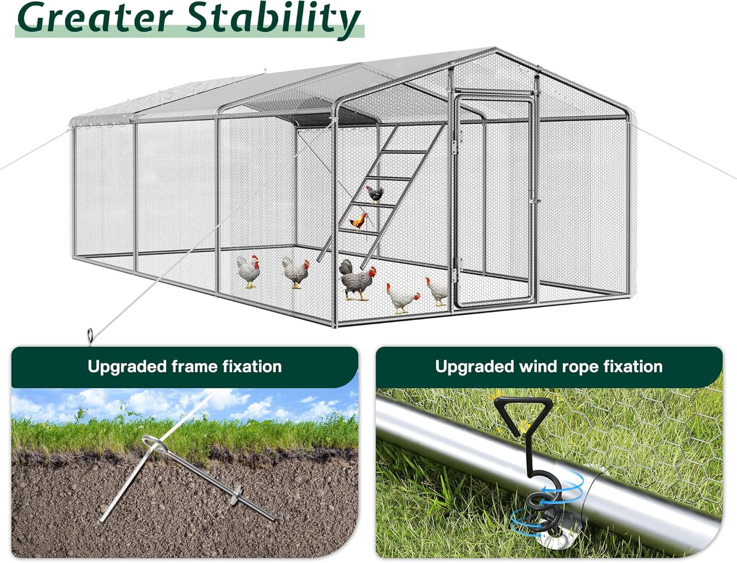 - 【Heavy-Duty Structure Built to Last】Constructed with galvanized steel pipes, spiral ground stakes, anchors, and zip ties for reinforced stability. The hinged door with a rounded frame offers smooth, snag-free access