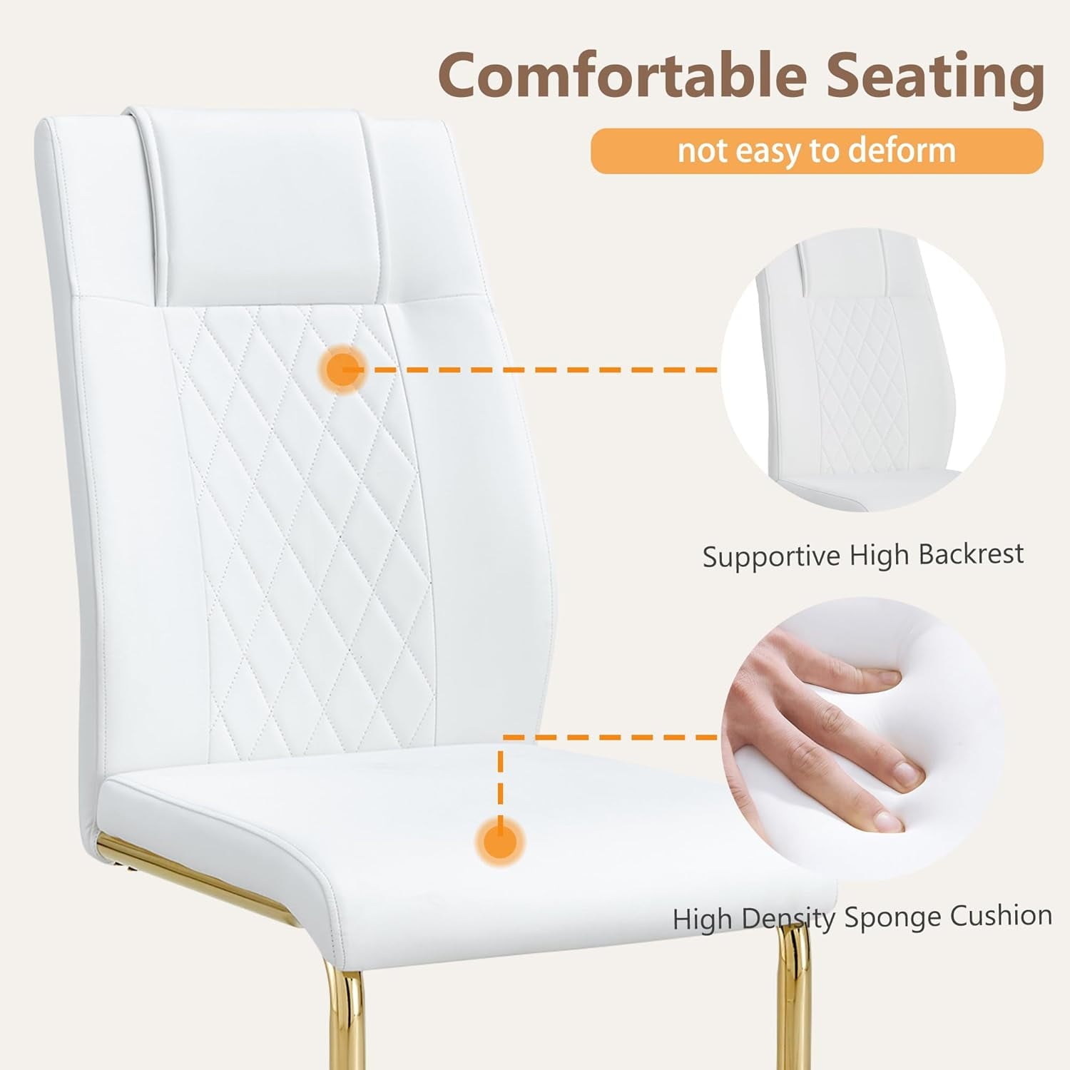 Upgrade your dining space with the JUFU Set of 4 White Dining Chairs. Designed with sleek faux leather upholstery and golden metal legs, these modern dining chairs blend comfort with a clean, minimalist look. The high backrest with diamond-stitched padding offers ergonomic support, ideal for long meals or gatherings. Whether used in the kitchen, dining room, or apartment setting, these armless chairs deliver style, function, and easy maintenance — perfect for any modern home.