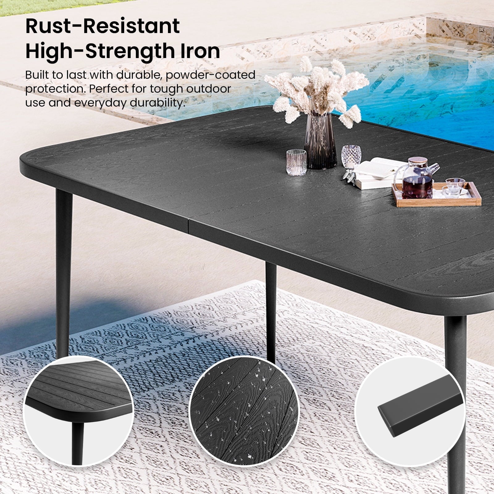 The JUSTLET 6-Person Outdoor Rectangular Metal Dining Table is built for durability and style, featuring a heavy-duty metal frame with a waterproof, sunproof, and rust-resistant coating, making it perfect for all-weather outdoor use. With a spacious 60'L x 38'W tabletop, it comfortably seats up to six people, ideal for dining or entertaining on patios, backyards, gardens, decks, or porches. The sleek slatted design not only enhances its modern look but also makes cleaning easy. Available in Black, Gray, and Brown, this all-weather table is the perfect blend of functionality and elegance for any outdoor space.