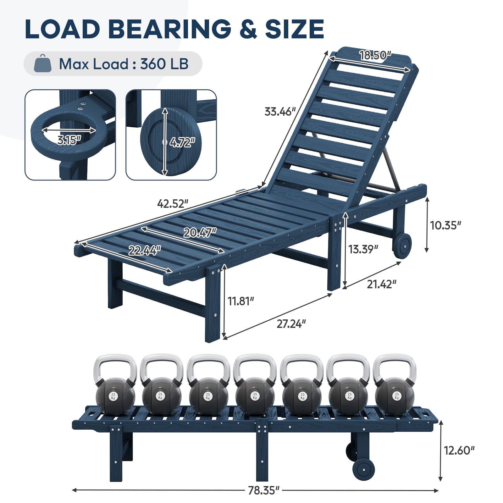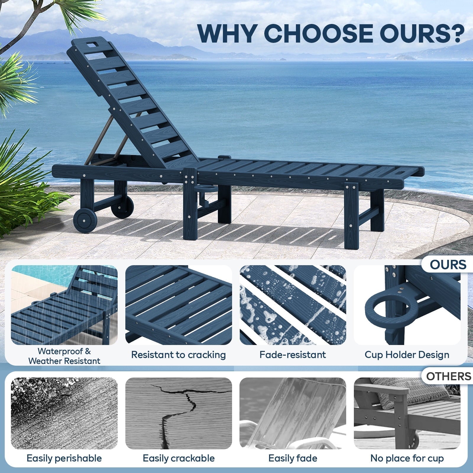 Indulge in ultimate outdoor relaxation with the JUSTLET HDPE Outdoor Chaise Lounges. Crafted from high - quality HDPE material, these lounges are the epitome of durability and style. Their waterproof and weather - resistant properties ensure they remain in pristine condition, no matter the elements. Whether it's the scorching sun, a sudden rain shower, or harsh winter winds, these lounges stand strong.The smooth surface not only adds a sleek aesthetic but also makes maintenance a breeze. A simple wipe is all it takes to keep them looking brand new. Equipped with sturdy wheels, you can effortlessly move the lounge to your desired spot in your patio, balcony, or garden, whether it's to catch the morning sun or find a shady nook for reading.The 5 - position adjustable backrest offers versatility, allowing you to customize your lounging experience. Lounge back for sunbathing, adjust it to a comfortable angle for reading your favorite book, or sit upright for a quick rest. The built - in cup holder is a thoughtful addition, keeping your refreshing drink within arm's reach.Assembly is a straightforward process, even for those new to DIY. With clear instructions and all necessary hardware included, you'll have your new favorite outdoor relaxation spot ready in no time. Upgrade your outdoor living space with the JUSTLET HDPE Outdoor Chaise Lounges and enjoy comfort and convenience like never before.