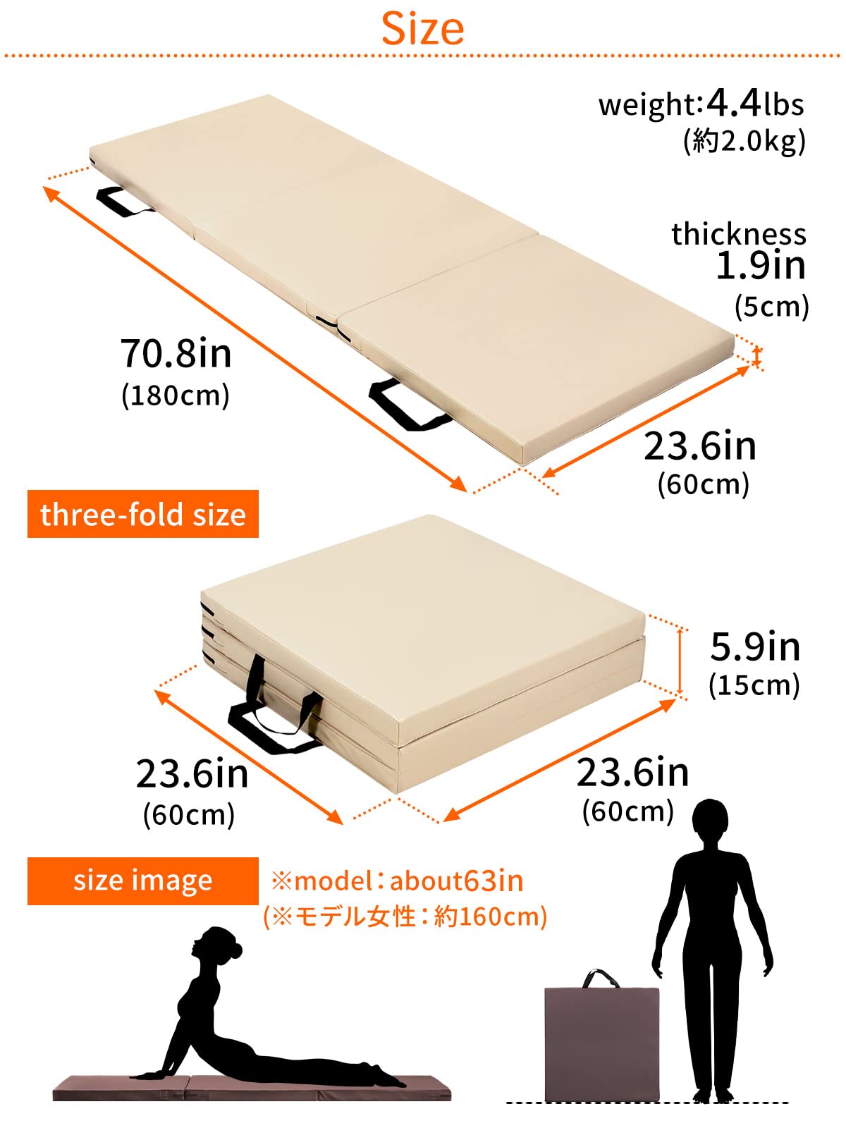 - Type : 3-stage folding, Dimensions : 71'x24'x2', Weight : 4.4Pounds