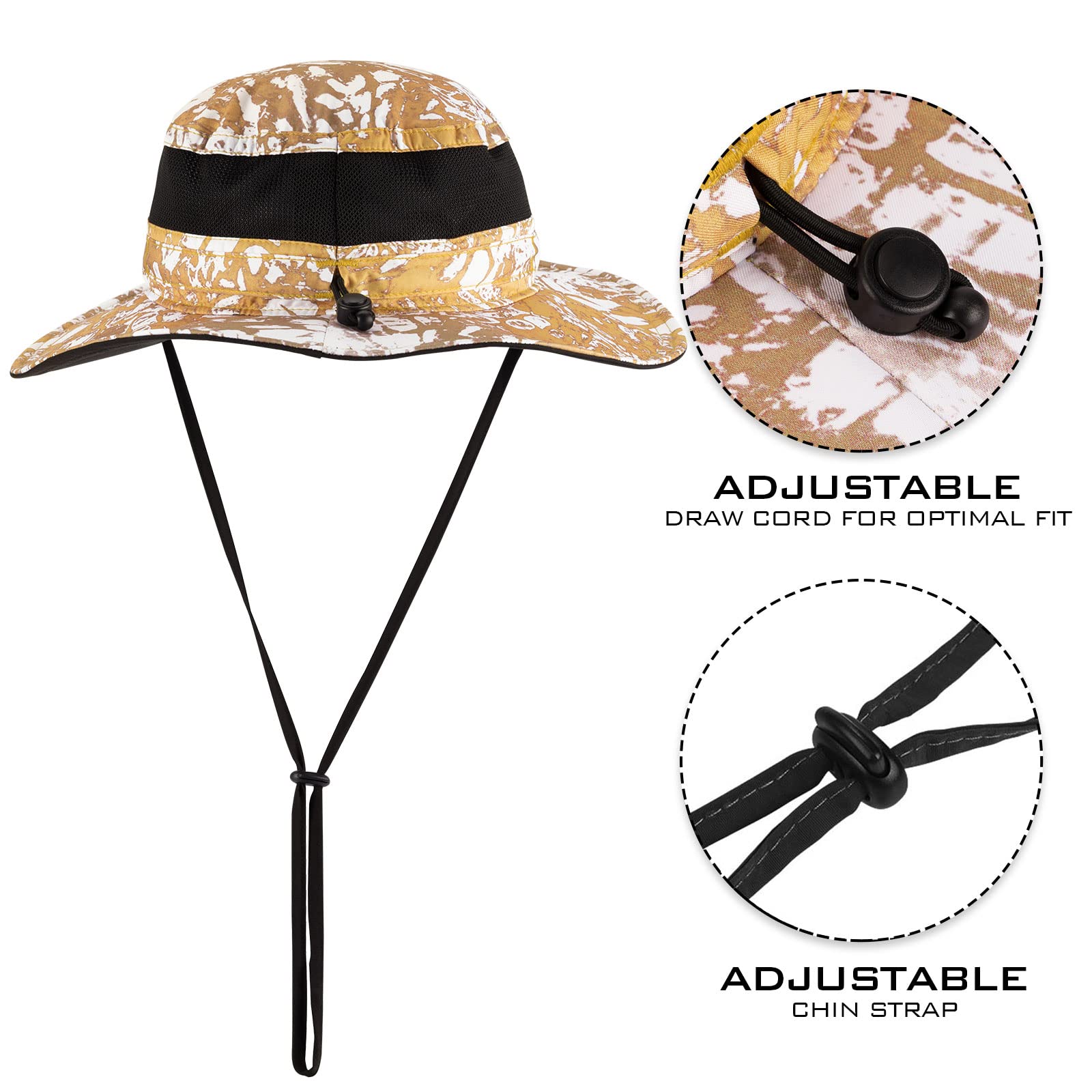 - ADJUSTIBLE FIT – This one-size fits all hat can be adjusted with the elastic draw string inside the head band and locked in place with the rear mounted toggle button. An adjustable chin strap ensures your hat will not be lost on a windy day.