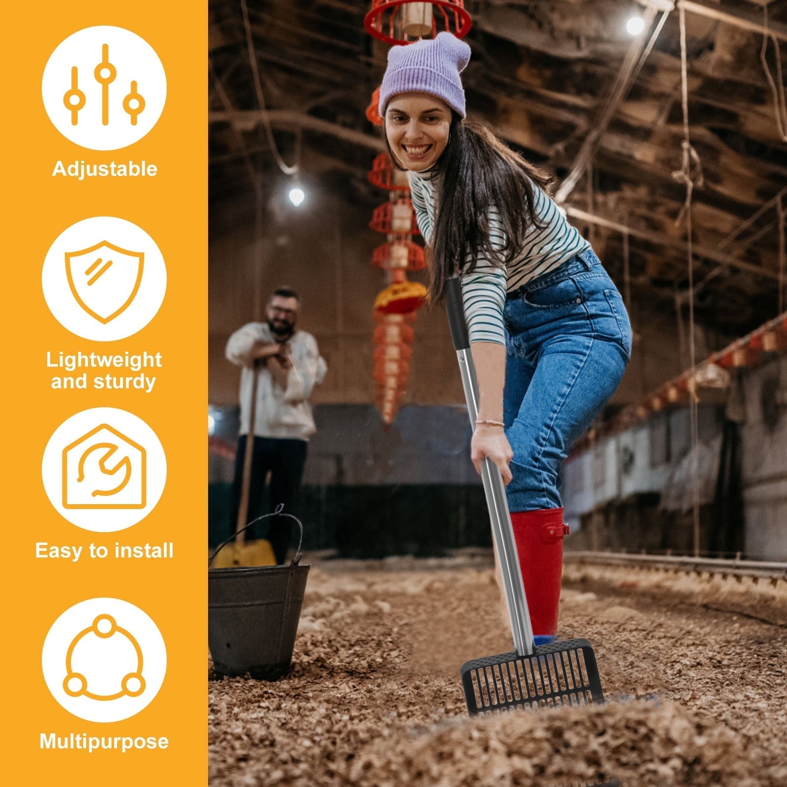 Description: This chicken manure shovel is equipped with an adjustable stainless steel handle, stainless steel shovel head with rust proof welding, handle made of stainless steel+PP+rubber plastic material for durability and comfort; 7 mm skeletonised shovel head for efficient sieving, hanging ring design for easy storage; it can be used for multi pet cleaning such as chicken coops, cat litter, etc. to keep your home neat and tidy