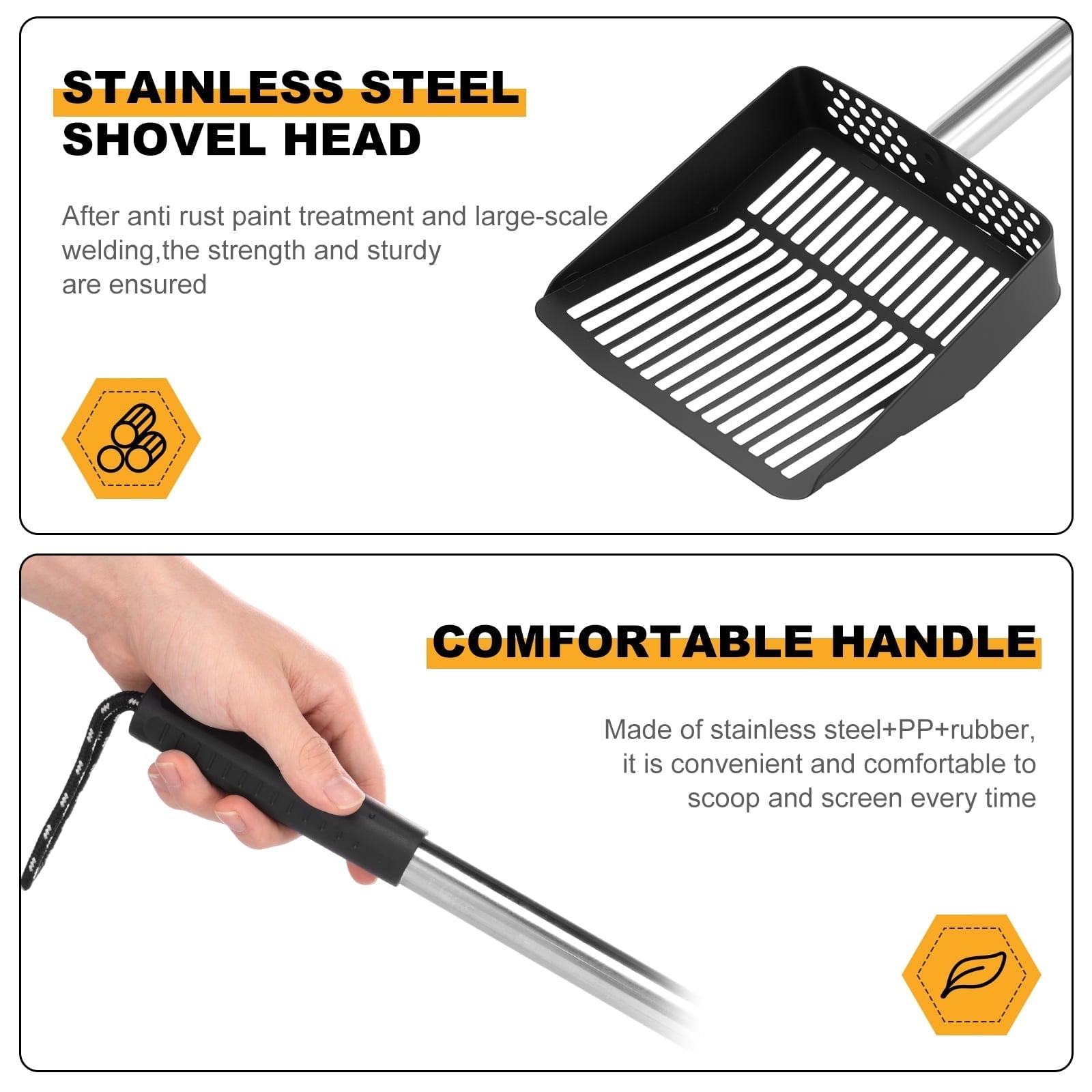 - Skeleton Design: linear skeletonised scoop head design makes waste sifting more efficient, the scoop head skeleton gap is 7 mm wide, which greatly saves your time and energy. Hanging ring design, can be hung and stored, does not take up space