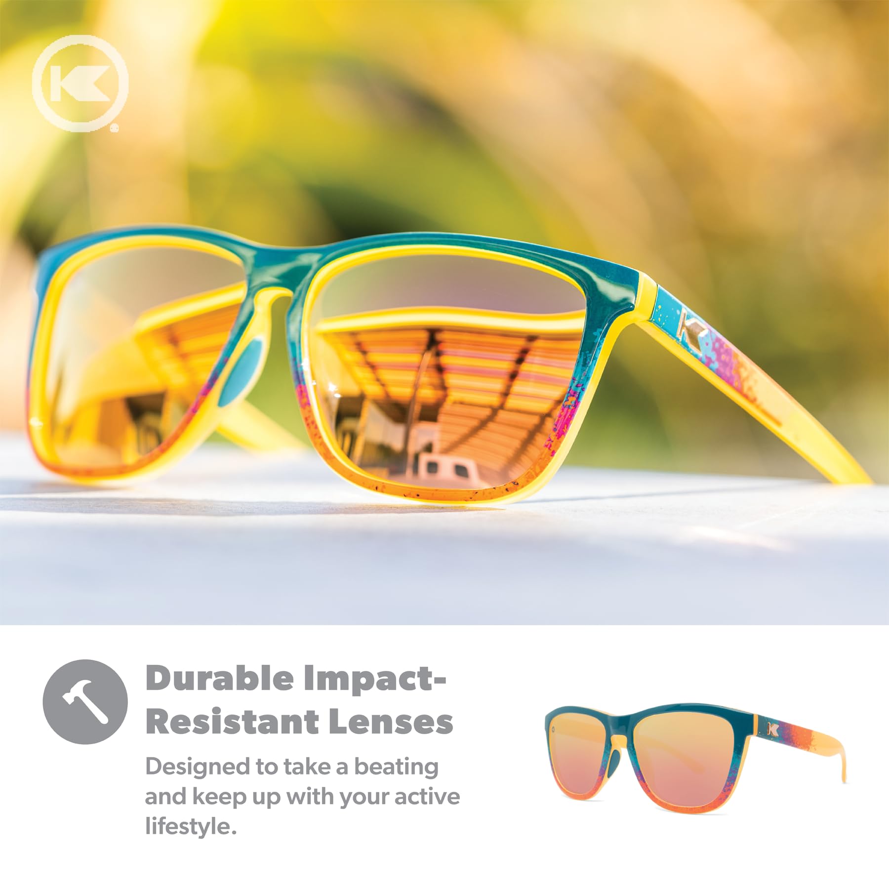 - For Any Outdoor Adventure: The Knockaround Premiums feature embedded rubber nose pads to stop the running sunglasses from slipping and sliding, while the impact resistant lenses provide your eyes with all the protection they need.