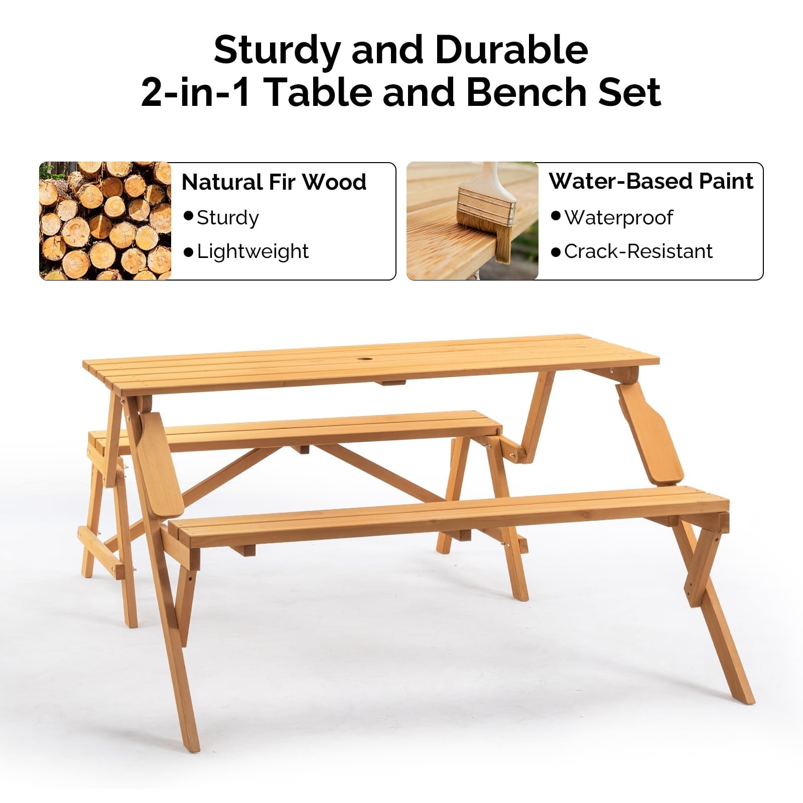 Transform your outdoor space with the Ktaxon 2-in-1 Transforming Picnic Table Set—a versatile Outdoor Convertible Bench that effortlessly switches between a spacious picnic table and a cozy Wooden Garden Bench. Crafted from durable fir wood with a teak finish, this Interchangeable Wooden Picnic Table Bench combines rustic charm with practicality, seating up to four people. The built-in umbrella hole provides shaded comfort on sunny days, while its lightweight, space-saving design makes it ideal for patios, decks, or gardens. Customize its natural finish to match your style, and enjoy seamless transitions between dining and lounging with this Convertible Patio Bench. Perfect for backyard gatherings or solo relaxation!