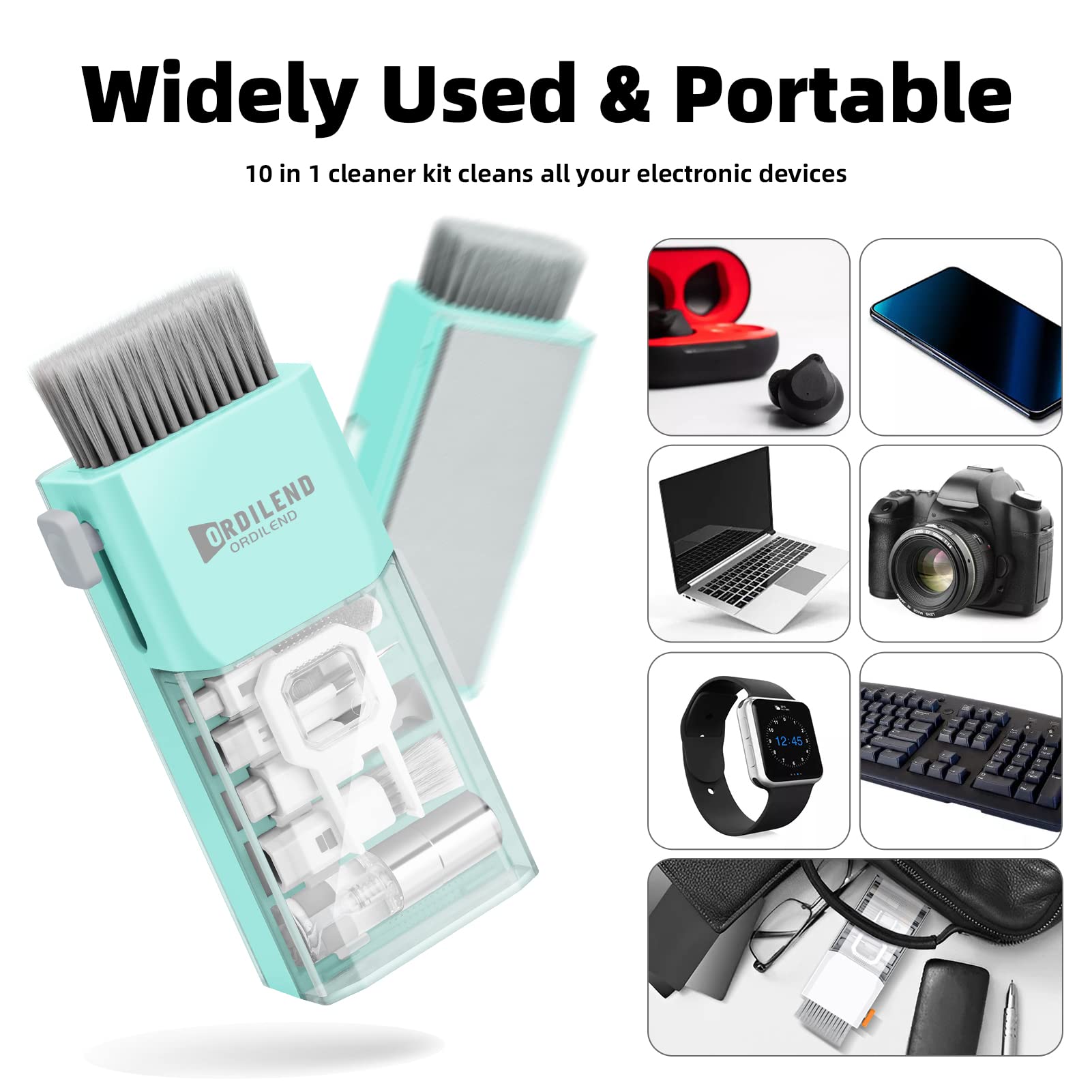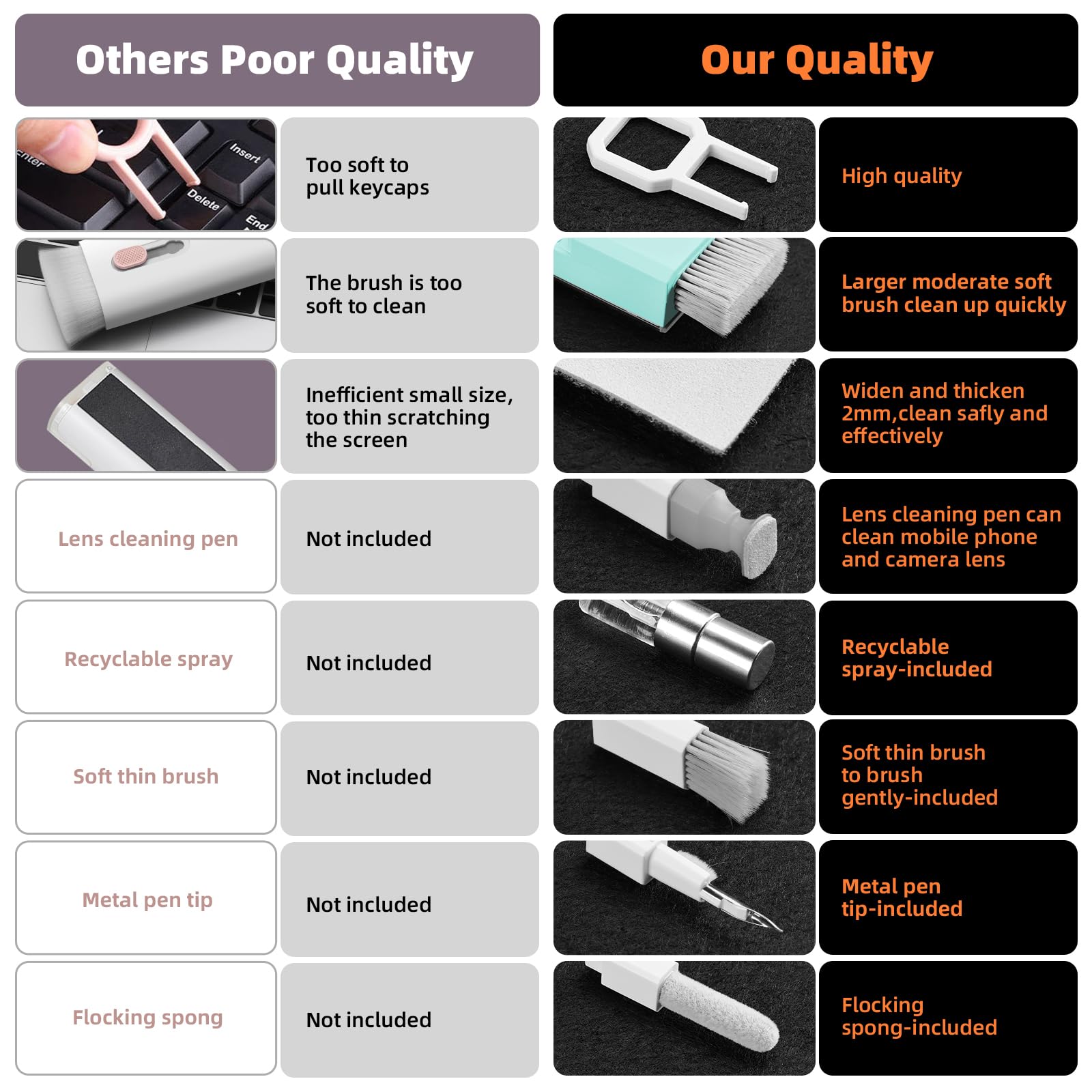 - DEEP CLEAN YOUR DEVICE The ultimate electronics cleaner kit to remove dust, wax, dirt and also disinfect and degrease your cell phone, tablet, computer, PC, laptop, TV. It comes with retractable large brush, polishing cleaning cloth X 2, keycap puller, metal pen tip, flocking sponge,thin soft brush, soft plastic lens cleaning pen, Patent number: 6247727