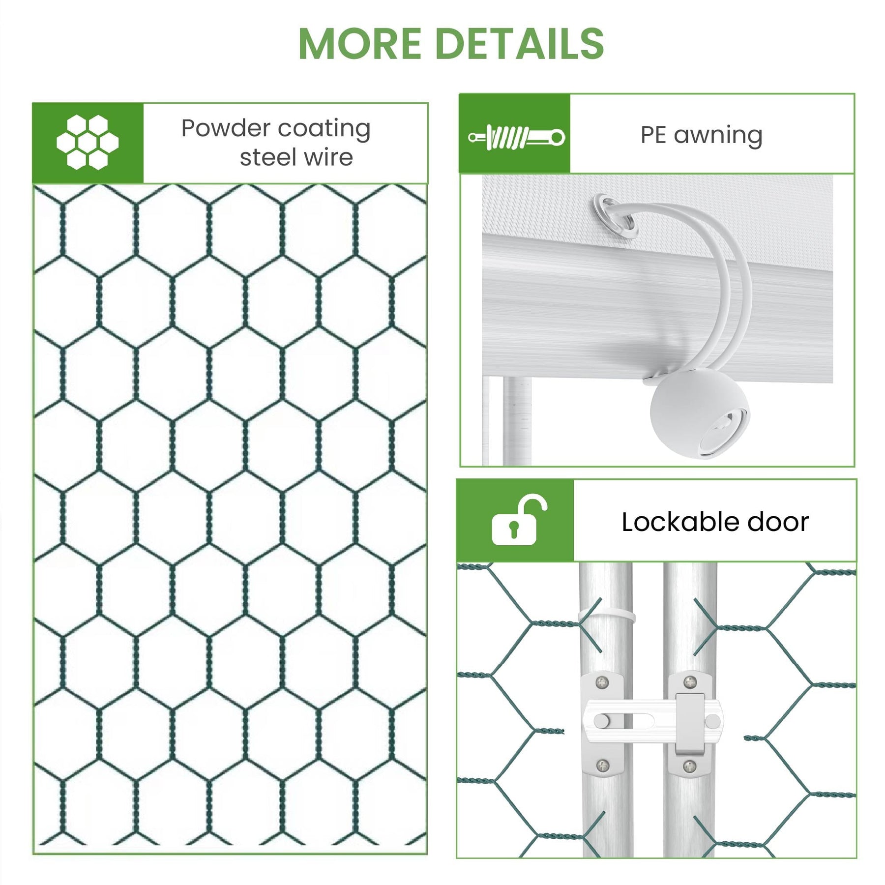 The use of durable metal frame, firmly support every inch of space, to ensure safety. With waterproof fabric UV protection cover, effectively resist wind and rain invasion and strong sunlight, so that your poultry grow healthily in a comfortable environment. The spacious size of 10' x 6.6' x 6.6' provides ample space for each poultry to move around, and the walk-in design facilitates daily management and cleaning.