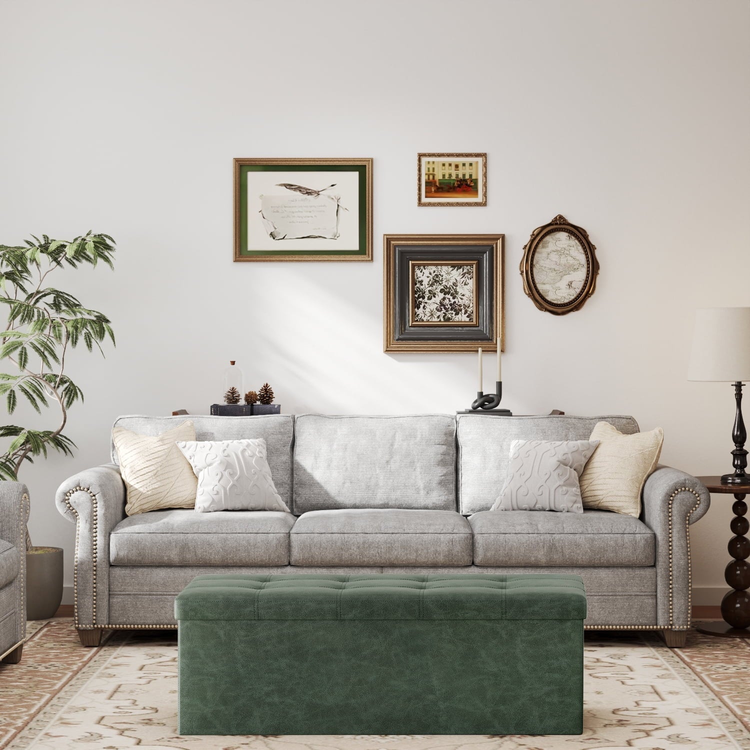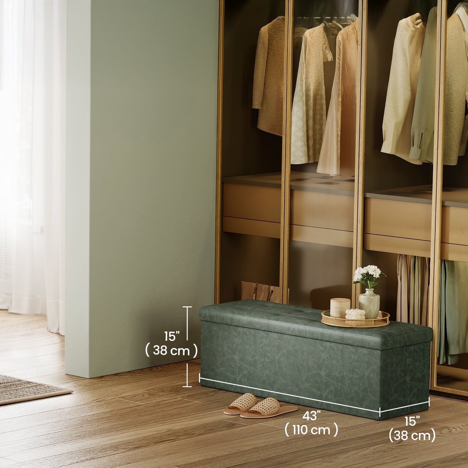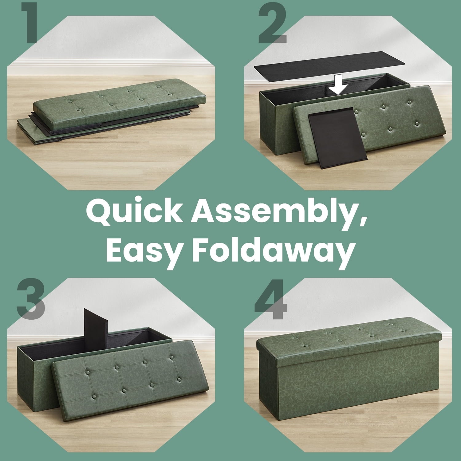 Upgrade your space with the *Collection’s 43-inch Foldable Storage Ottoman Bench*, combining versatility and durability. Designed for quick assembly, this ottoman unfolds in seconds with a sturdy base plate, offering 35 gal (131 L) of storage for blankets, books, or shoes. Built with reinforced MDF panels and metal corner guards, it supports up to 660 lbs (300 kg), while the 1-inch high-density foam padding ensures lasting comfort as a seat or footrest. Perfect for living rooms, bedrooms, or hallways, its space-saving foldable design allows easy storage when not in use. Crafted in sleek synthetic leather and available in Forest Green, it blends functionality with modern style.Material: MDF (Medium Density Fiberboard), Synthetic Leather, Foam PaddingProduct Size: 15'D x 43'W x 15'H (38 x 110 x 38 cm)Product Weight: 19.4 lb (8.8 kg)
