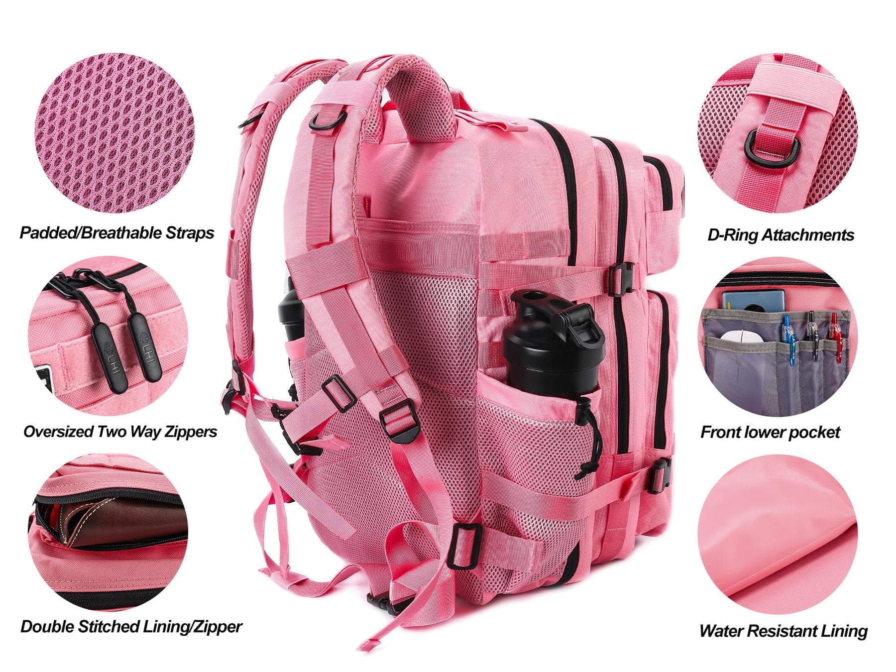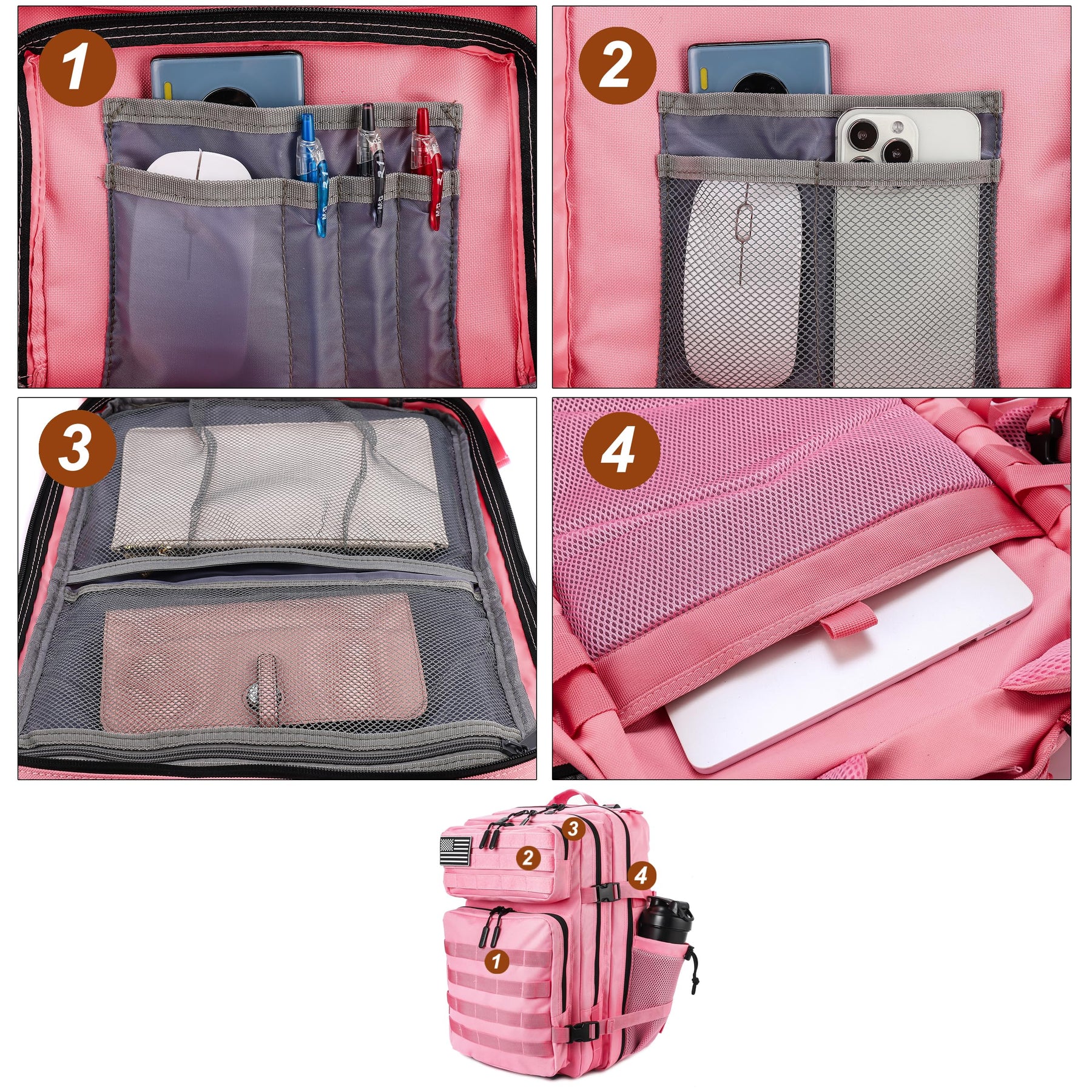 - 4. This tactical backpack has multiple compartments and zip closure pockets, including interior zip pockets and mesh pockets, bottle holder on the side holds 750ml water bottles, it allows you to put almost all necessities inside, perfect for outdoor activities and military hobbies also cool for fashion lovers!