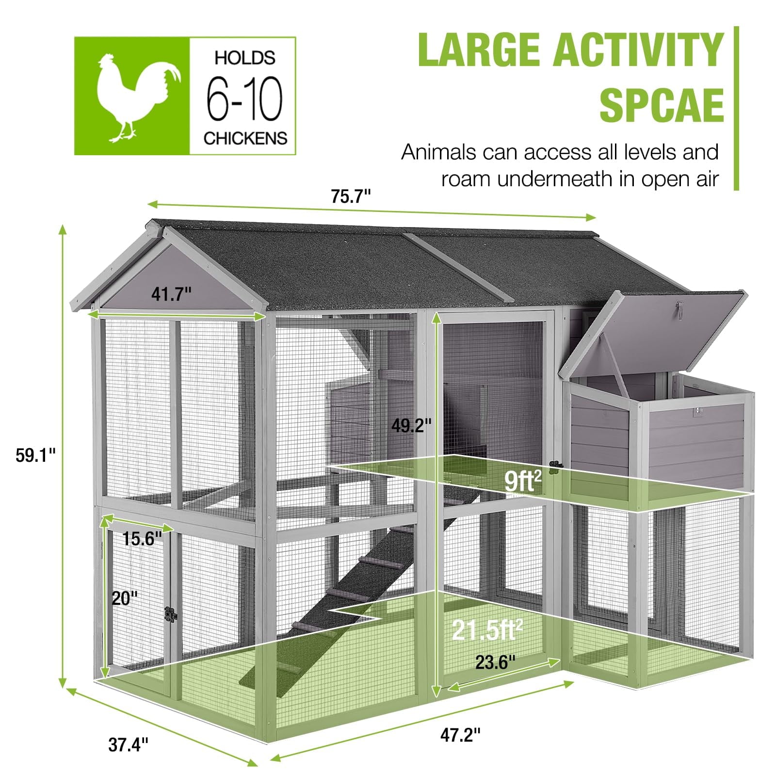 • Spacious Area: Features a 9 ft² elevated sleeping area and a 21.5 ft² extended pen, offering ample space for 6-10 chickens to live, rest, and play