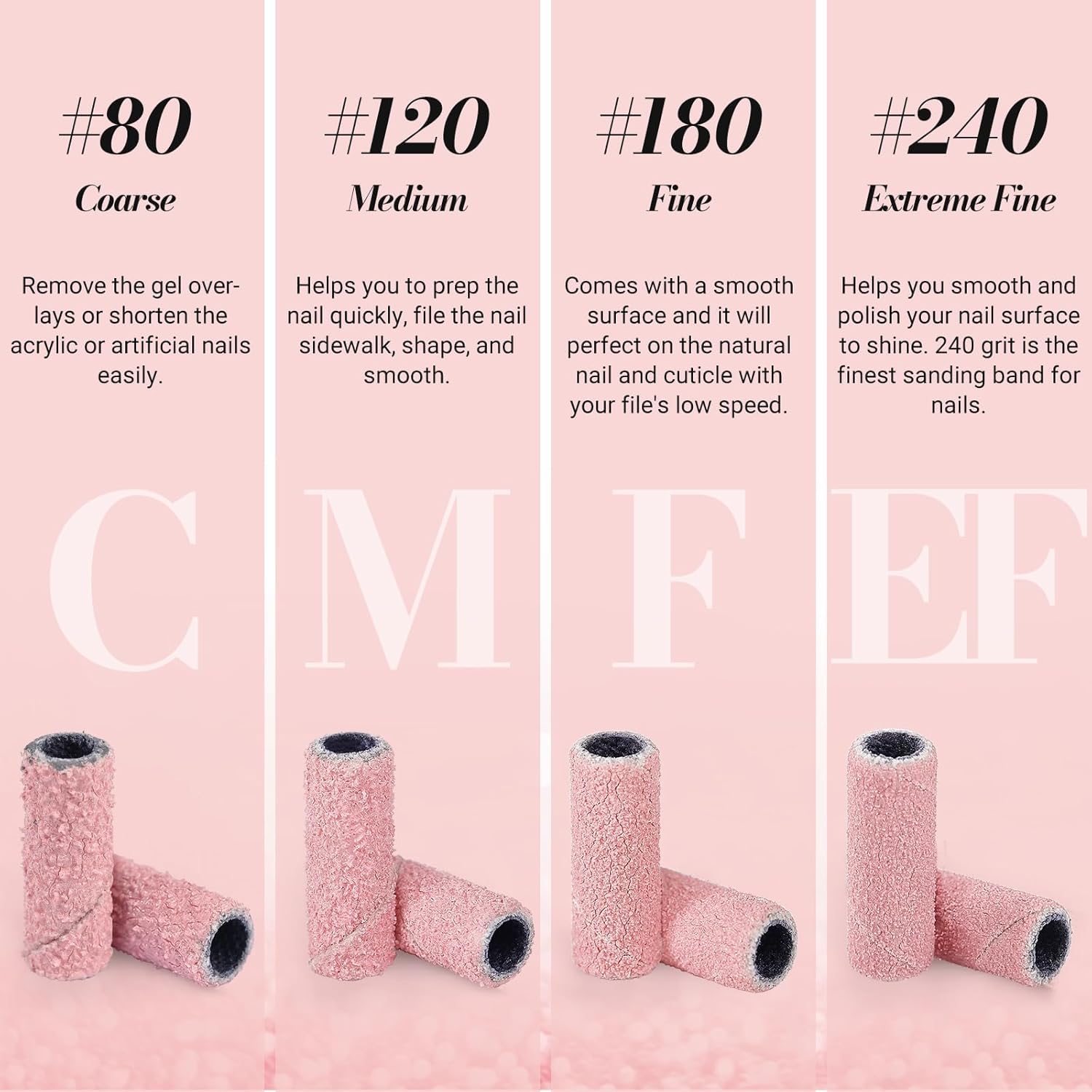 - Various Grit Options: #80 remove the gel overlays or shorten the acrylic or artificial nails easily. #120 helps you to prep the nail quickly, file the nail sidewalk, shape, and smooth. #180 comes with a smooth surface and it will perfect on the natural nail and cuticle with your file's low speed. #240 helps you smooth and polish your nail surface to shine.