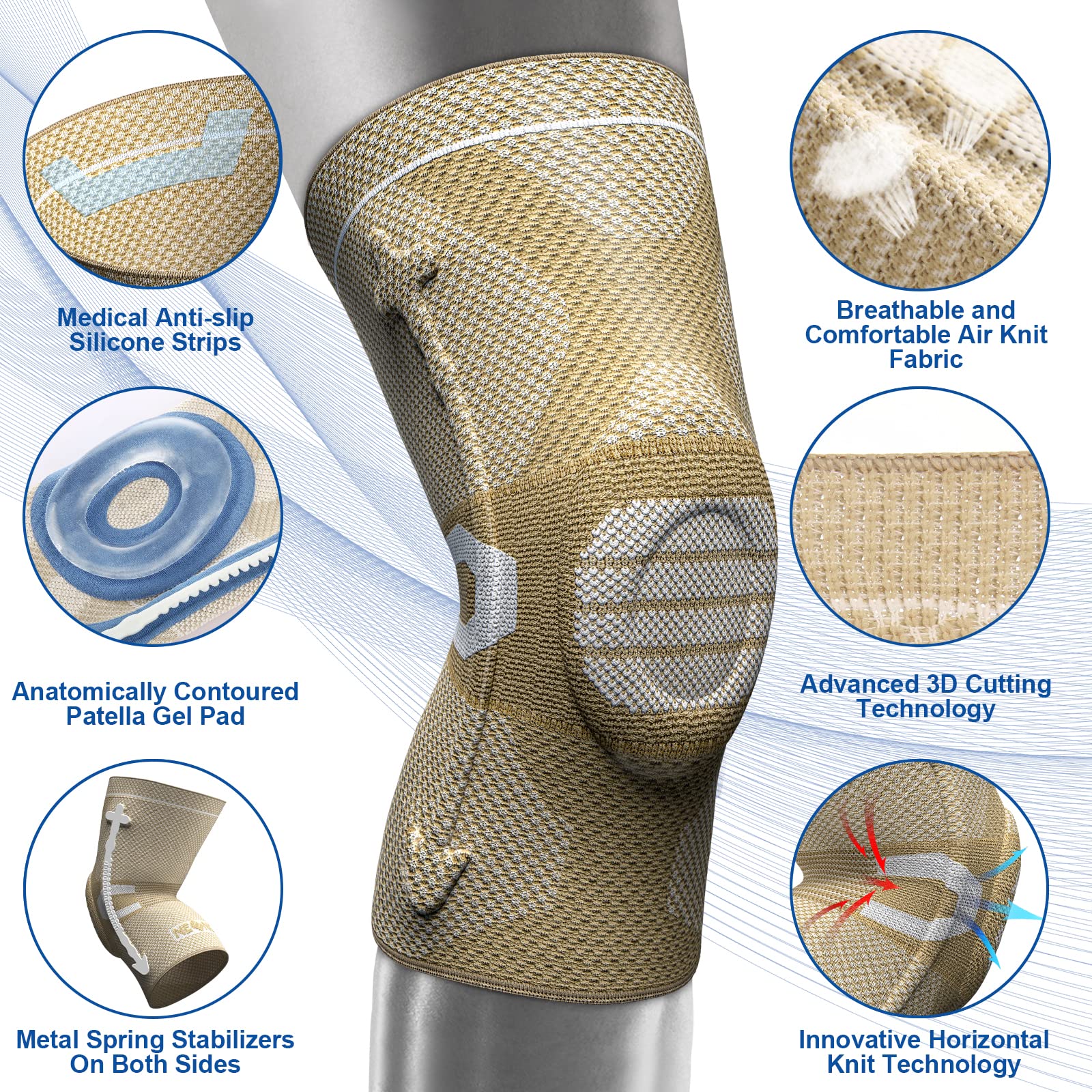 • UPGRADED DESIGN— Adopt the Anti-Inflammatory Therapy, overcome the defects of similar products, medical knee sleeves with no allergies and itchiness. With high-elastic tight and breathable compression fabric to fit perfectly with your knee curve, 3D structure of woven, high-precision knitting cutting technology. Side spring stabilizers on both sides and patella gel pad won't fall off easily during using, Non-slip gel strips to avoid slide or roll during exercise, It will stay in place all day!