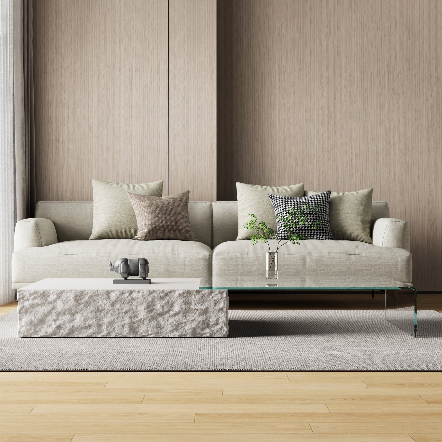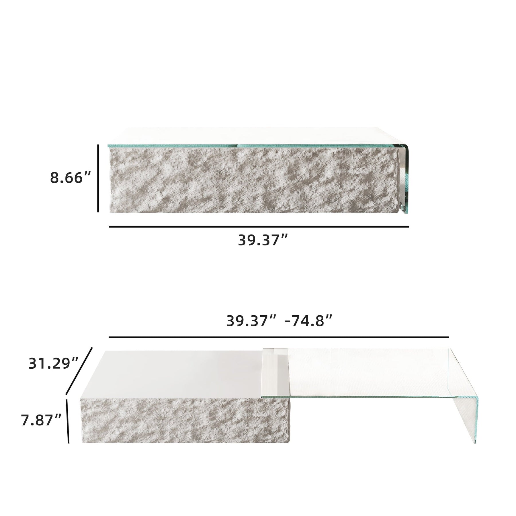 This modern rectangular coffee table features a luxurious faux marble fiberglass surface, combining elegance with durability. It extends from 39.37' to 74.8' long, with a 31.3' width and 8.66' height, providing ample space for snacks, decor, or gatherings. Built with high-quality fiberglass and glass, it offers stability and easy cleaning with a scratch- and heat-resistant surface. Ideal for living rooms, offices, or reception areas.