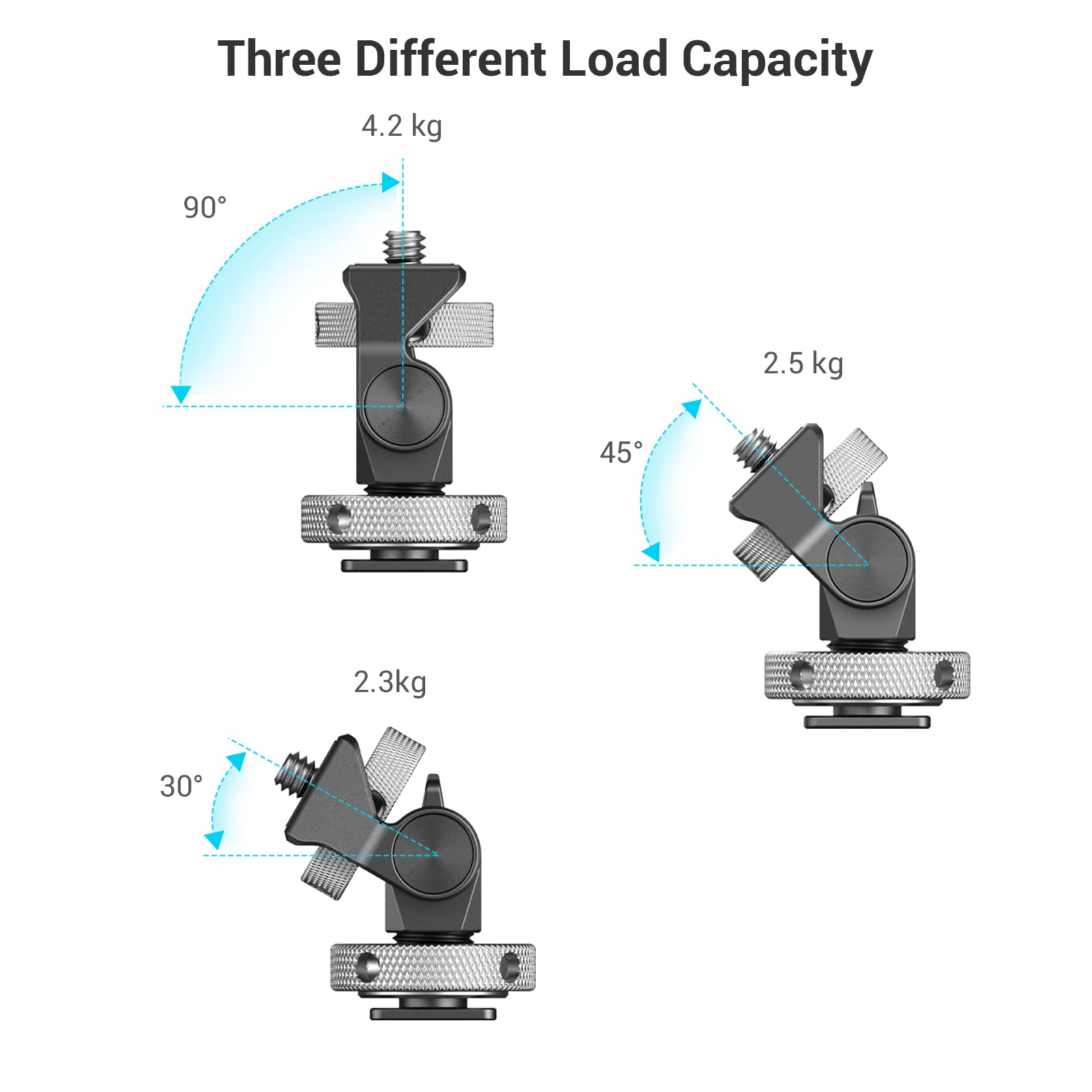 - Note: Different tilt angle has different load capcaity, 90° load capacity<4.2kg; 45° tilt load capacity<2.5kg, 30° tilt load capacity<2.3kg. For the safety, please do use the Allen Wrench to re-tighten the 1/4'' knurled screw for further security