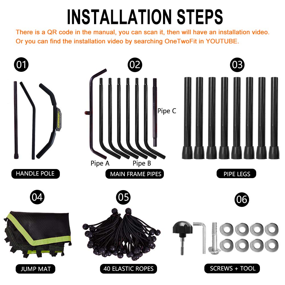 Details: 【NOTE】Trampoline equipment setup requires some physical labor-please read user manual or find the installation video by searching OneTwoFit in YOUTUBE for set-up and it is best having two people available set-up.