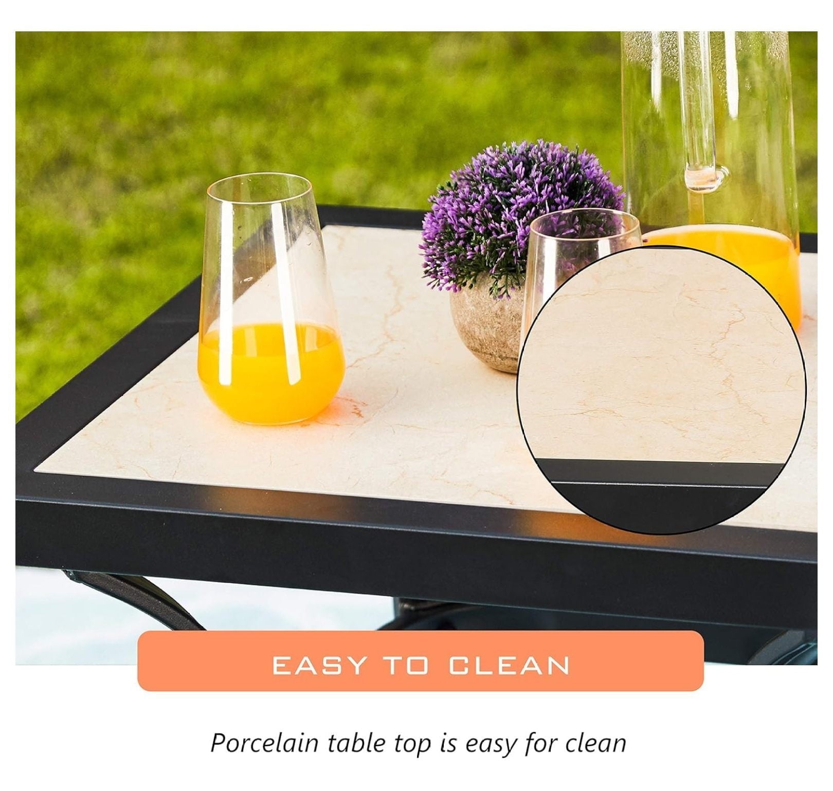 Specifications Features Specifications Color Black Table 20.9' (L) x 20.9' (W) x 19.7' (H) Material Metal Frame Features Built from a powdercoated steel frameStylish design fit with your backyard decorSteel frame, sturdy and durablePorcelain table topEasy to clean Outdoor Square Table Add fun to your outdoor experience When you are outdoors with friends or with your family. You always want to have such comfortable and stylish outdoor furniture. Our store will a high quality, stylish and comfortable home brand. It can be used in many occasions and can add decoration to your backyard, pool and more. Description This outdoor furniture includes 1 Table. If youre looking for a collection of outdoor furniture, Our store is your best choice. Sturdy Frame Powder coated wrought iron which support a long time use. Easy To Clean Porcelain table top, easy to clean. Modern Design The modern design is suitable for outdoor decoration.