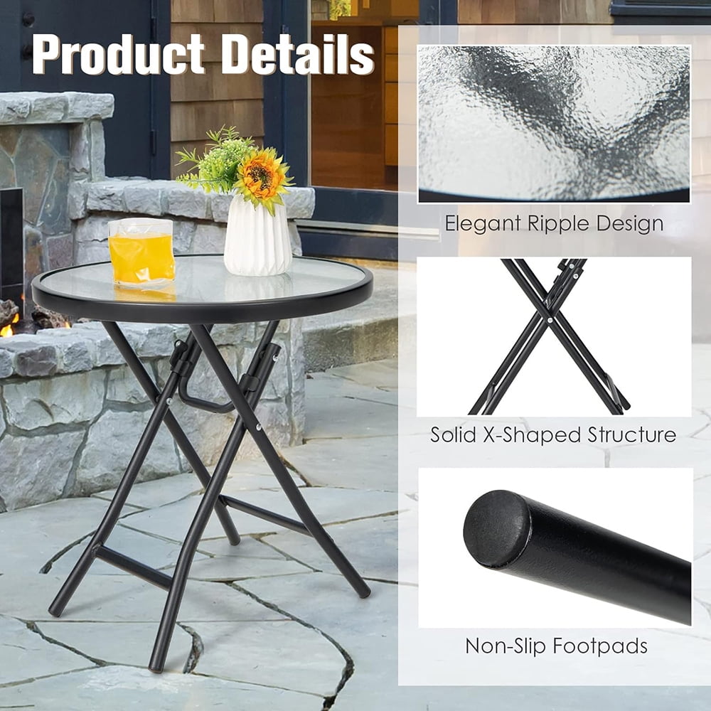 Upgrade your outdoor space with our Folding & Portable Patio Side Table. Designed for convenience and versatility, this table is packed with features that make it a must-have addition to your furniture collection.Featuring a quick-folding design, this patio side table allows for easy storage and transport. Simply turn the security lock upward or downward to effortlessly fold or expand the table. With its compact folding size of 27' x 18' x 2.5' (L x W x H) and lightweight construction weighing only 8 lbs, you can easily carry it wherever you go.The tabletop of this side table is made of high-grade tempered glass with a thickness of 0.2'. This ensures exceptional durability and against to scratches, guaranteeing a long-lasting service life. Adding to its appeal, the elegant ripple design on the tabletop enhances the overall aesthetic of your outdoor or indoor space.Built with a reinforced steel frame, this patio side table offers superior sturdiness and stability. Each steel pipe is well powder-coated for added protection against the elements. The X-shaped structure, fixed by the security lock, further enhances stability, making it a reliable choice for various occasions.Enjoy the wide range of applications this side table offers. Perfect for outdoor use in your backyard, poolside area, garden, or balcony, it provides high stability in any setting. Additionally, it is equally suitable for indoor use, serving as a versatile coffee or snack table based on your needsThis folding glass table is ready to use straight out of the package. Simply unfold it, and you're good to go. Cleaning and maintenance are a breeze with just a damp cloth, saving you time and effort.
