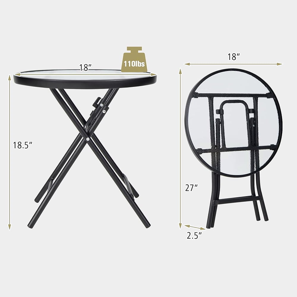 Upgrade your outdoor space with our Folding & Portable Patio Side Table. Designed for convenience and versatility, this table is packed with features that make it a must-have addition to your furniture collection.Featuring a quick-folding design, this patio side table allows for easy storage and transport. Simply turn the security lock upward or downward to effortlessly fold or expand the table. With its compact folding size of 27' x 18' x 2.5' (L x W x H) and lightweight construction weighing only 8 lbs, you can easily carry it wherever you go.The tabletop of this side table is made of high-grade tempered glass with a thickness of 0.2'. This ensures exceptional durability and against to scratches, guaranteeing a long-lasting service life. Adding to its appeal, the elegant ripple design on the tabletop enhances the overall aesthetic of your outdoor or indoor space.Built with a reinforced steel frame, this patio side table offers superior sturdiness and stability. Each steel pipe is well powder-coated for added protection against the elements. The X-shaped structure, fixed by the security lock, further enhances stability, making it a reliable choice for various occasions.Enjoy the wide range of applications this side table offers. Perfect for outdoor use in your backyard, poolside area, garden, or balcony, it provides high stability in any setting. Additionally, it is equally suitable for indoor use, serving as a versatile coffee or snack table based on your needsThis folding glass table is ready to use straight out of the package. Simply unfold it, and you're good to go. Cleaning and maintenance are a breeze with just a damp cloth, saving you time and effort.