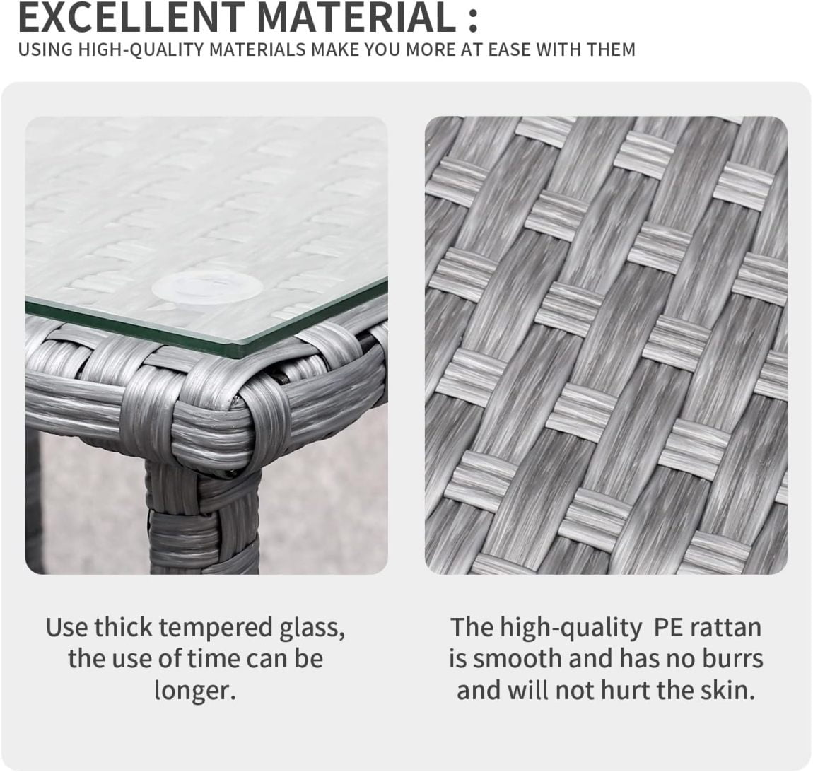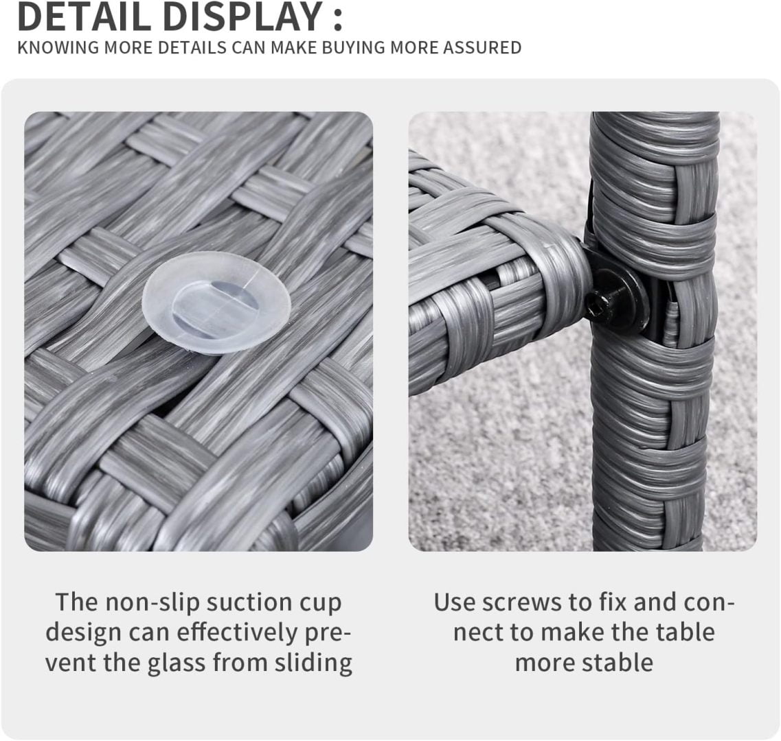 Size: square table-2 tier. Feature:This square tea end table is built from powder coated steel frame and high quality PE wicker, it is sturdy and durable.Add the glass tabletop is easy to clean, double layers construction to get more storage space.Simple and stylish design that will fit with any decor, and gives it a wide range of application scenarios, such as courtyard, garden, balcony, deck, poolside etc. Specifications:Color: Grey.Material: steel frame; PE rattan; tempered glass.Product Size: 17.7'L X 17.7'W X 18.5'H.Package Size: 20'L X 19'W X 4'H.Package include:--1 x table.--1 x 0.2 inches tempered glass.--1 x assembly instructions, necessary tools. Notice:Unpack: Please check whether the glass is broken after opening the package, for fear that not to cut your finger when taking it.Assemble: Don't tighten each screw at the beginning, advised to leave each screw a little loose till all of the screws are in, and then tighten all of them. Customer service:If there is any issue with the product, please contact us first, we will quickly solve any doubt for you. Your satisfaction is always our top priority!