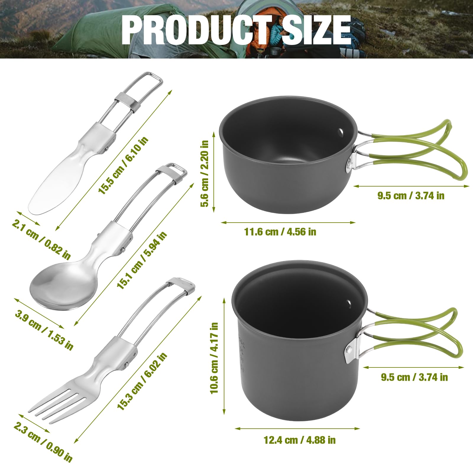 - 🌲【Best Camping Cookware Kit】: The camping cooking set is the ultimate solution for outdoor cooking. It includes 2 x camping pots, 1 set* foldable cutlery set (a scoop, a fork, a cutter, with storage bag),1 x Carry bag. Camping cookware kit is suitable for 2-3 people, perfect for your family outdoor camping. let's enjoy camping together!