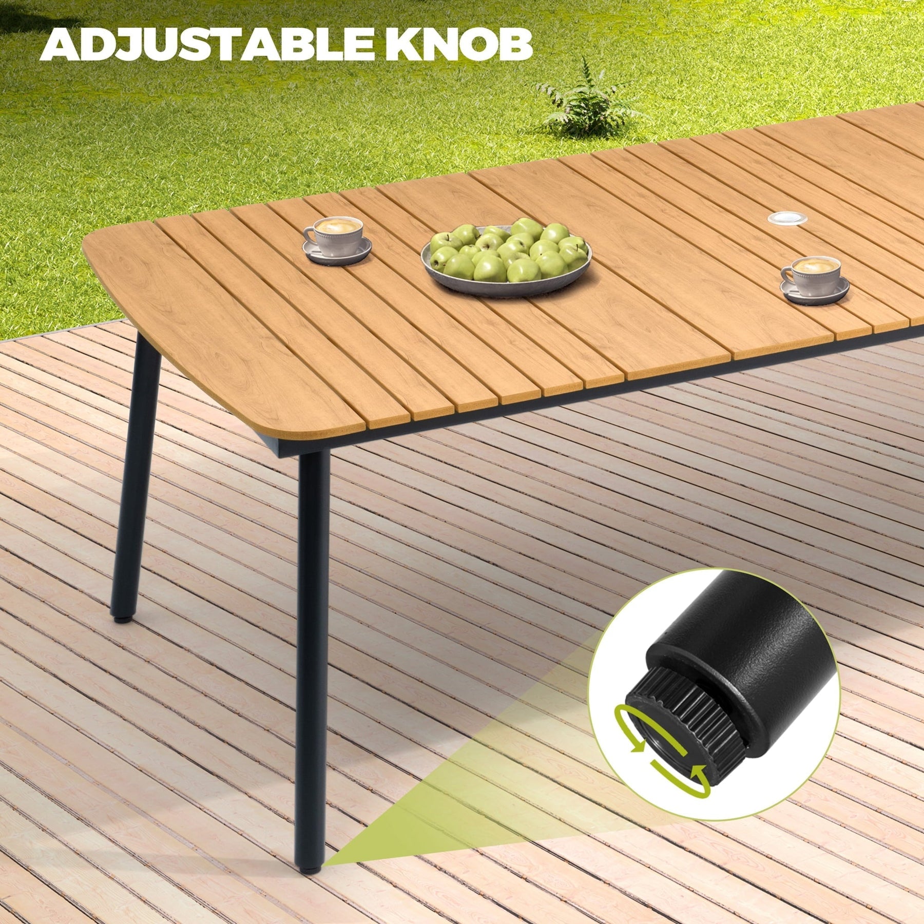 Elevate your outdoor dining experience with the Pellebant 93' Patio Dining Table, designed to bring both style and functionality to your backyard, garden, or deck. With a spacious surface that comfortably seats 8 to 12 people, this table is perfect for weekend gatherings, summer parties, or everyday meals with loved ones. Built with a weather-resistant aluminum frame and topped with a durable wood-plastic composite (WPC) slatted surface, this table offers both strength and elegance. The slatted design allows rainwater to drain quickly, while the 1.8' umbrella hole provides the flexibility to add shade during sunny afternoons. Adjustable foot pads ensure the table stays stable on uneven surfaces, and the anti-rust, scratch-resistant materials make it easy to clean and maintain. Whether you're hosting guests or enjoying a quiet meal outdoors, the Pellebant patio table delivers a perfect blend of durability, comfort, and contemporary charm.