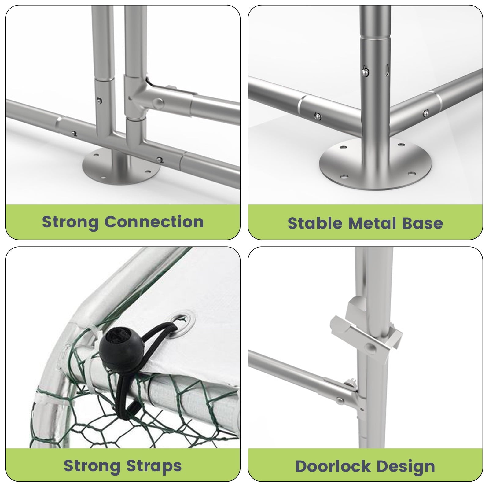 - Secure Lockable Door: Enhanced Accessibility and Safety: Featuring a sturdy gate and a reinforced locking mechanism, this chicken run offers easy access for you while preventing escapes and keeping out unwanted wild animals. The thoughtfully narrowed gap design ensures added security, allowing you to enjoy your time with your pets without worrying about their safety.