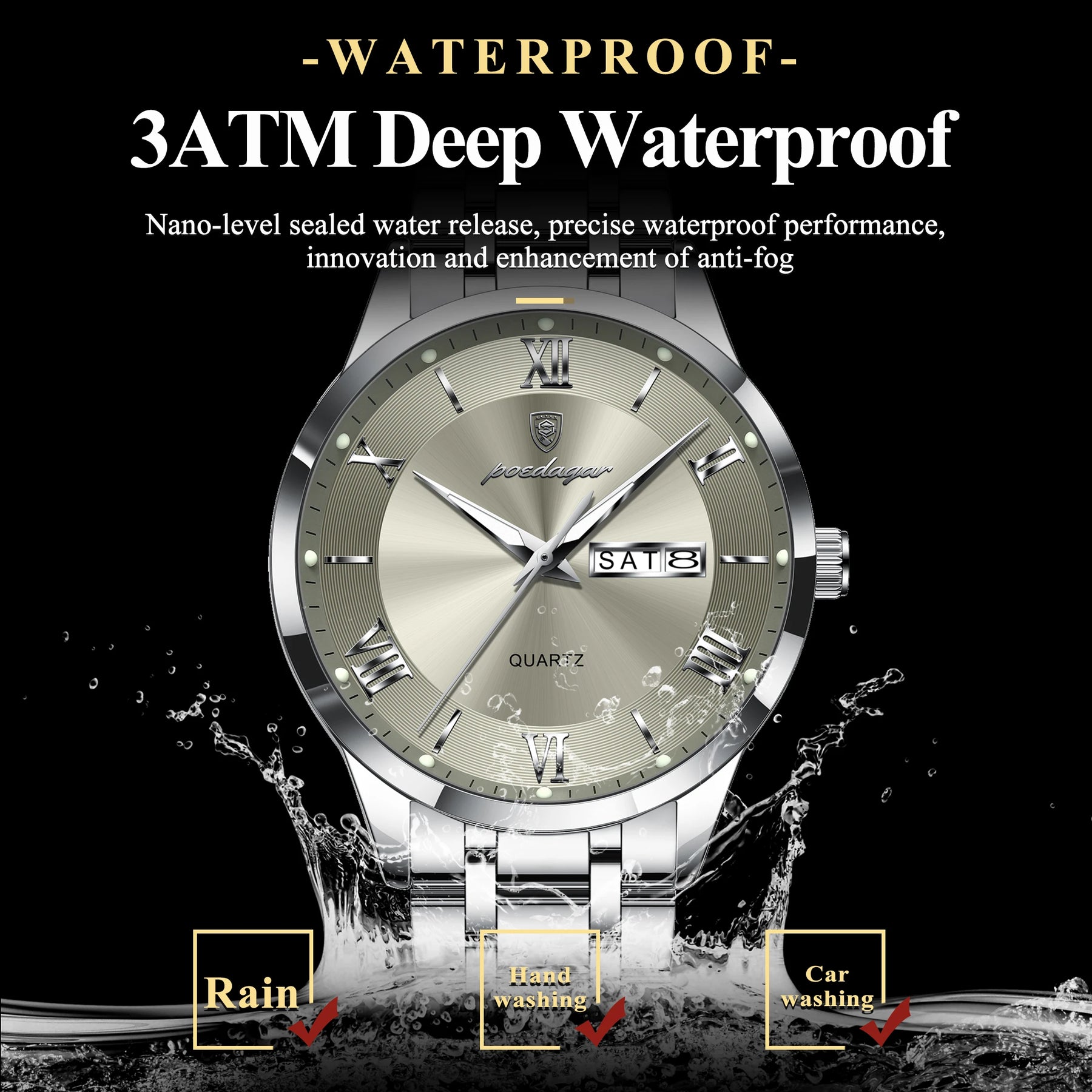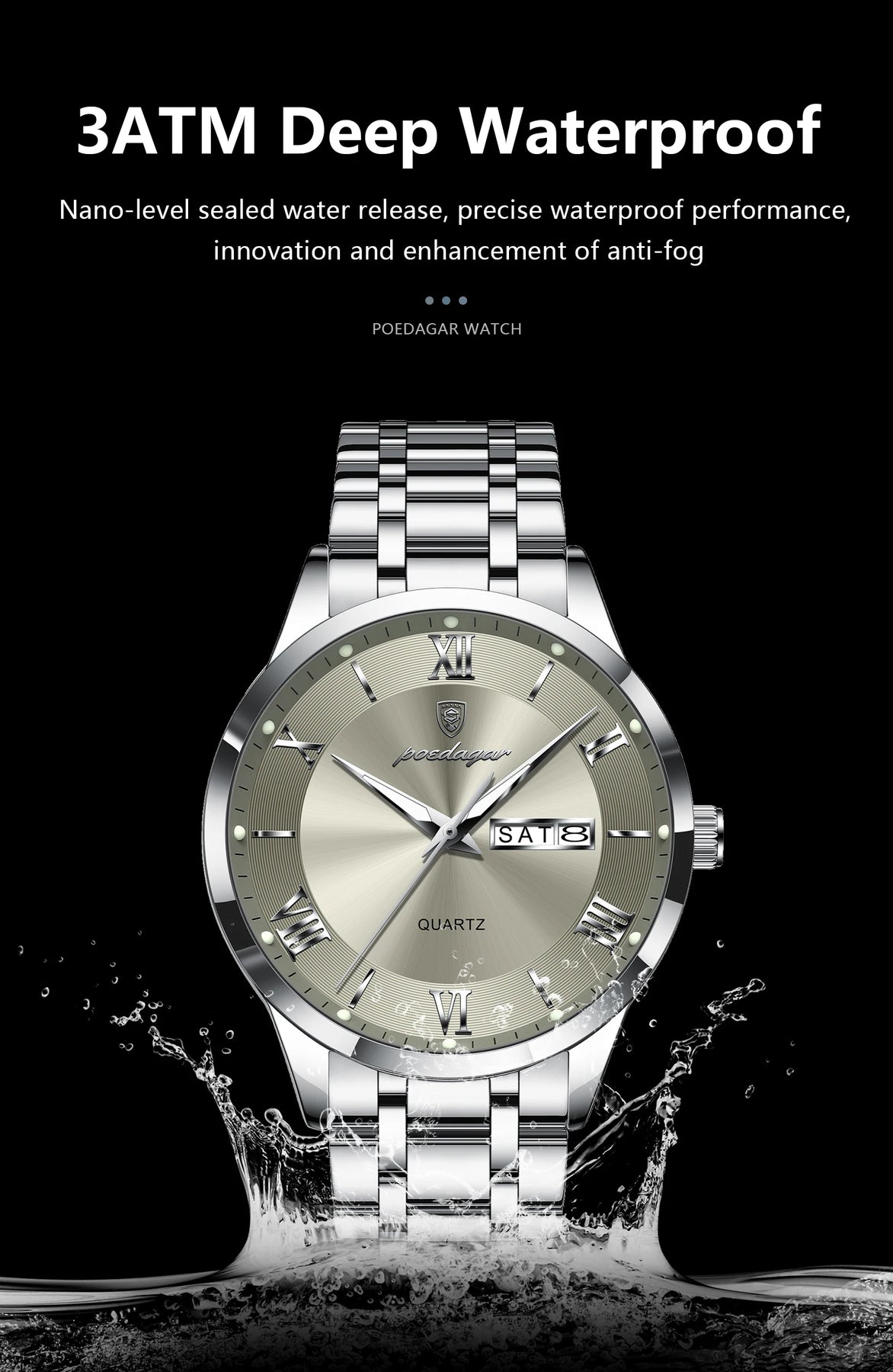 POEDAGAR Business Fashion Man Watch Waterproof Luminous Date Week Male Wristwatch Stainless Steel Quartz Men Watches Reloj +Box