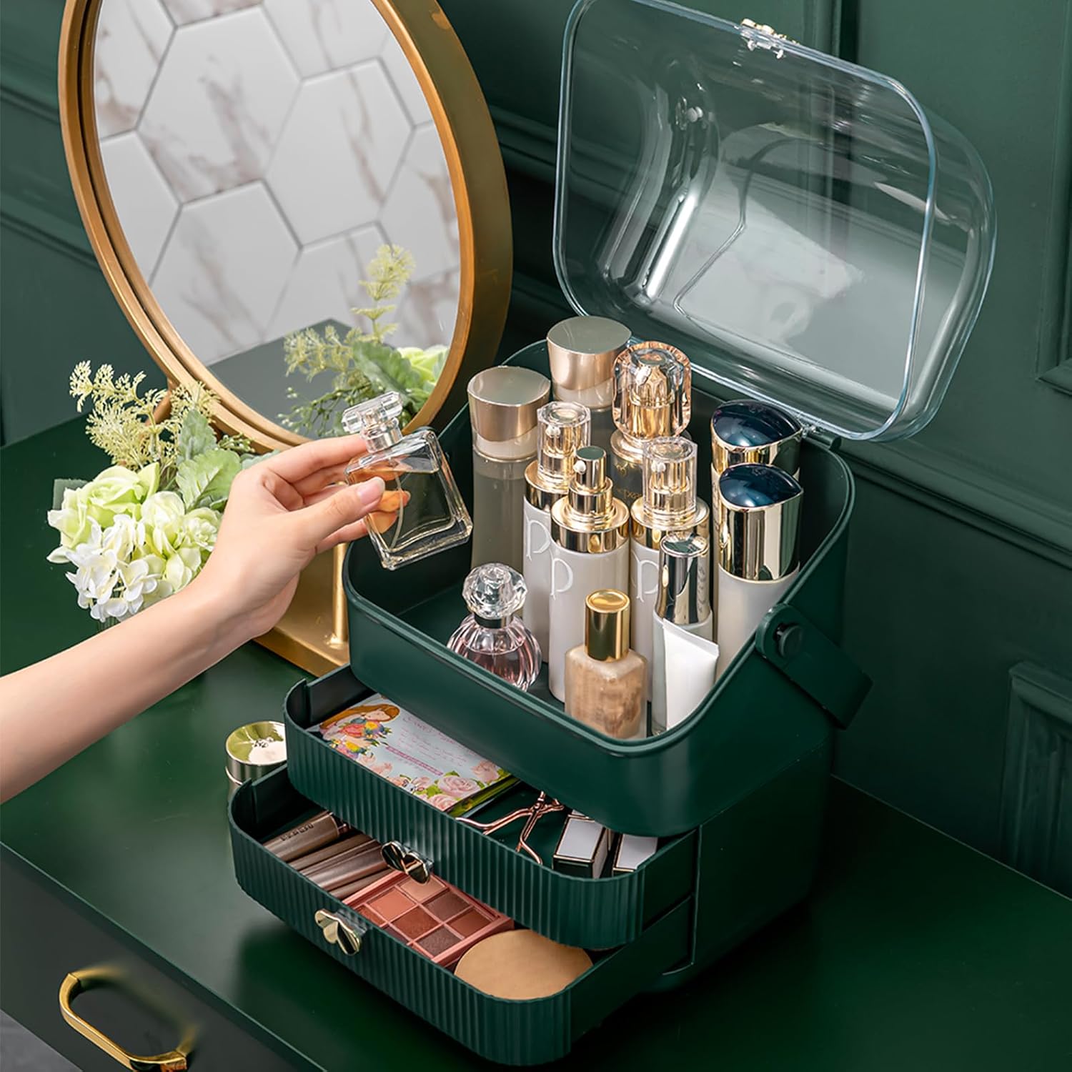 - 초대형 용량의 뷰티 오거나이저 케이스: 커버가 있는 방진 메이크업 오거나이저 박스는 다양한 모양과 크기의 화장품을 보관하면서 잘 정리할 수 있습니다. 주얼리, 립스틱, 메이크업 브러시, 모든 유형의 메이크업, 매니큐어 및 클리퍼, 스킨 케어 및 향수병 등을 담을 수 있습니다.