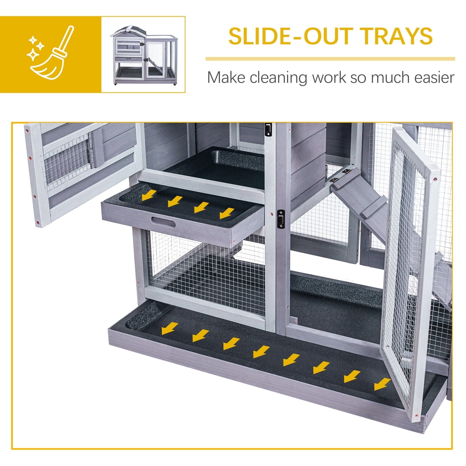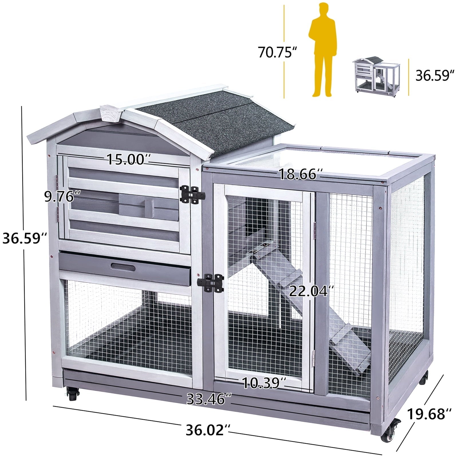 đăVersatile for Small Petsă- Our Rabbit Hutch is a haven for rabbits, guinea pigs, chicks, hedgehogs, ferrets, and more. It offers a blend of security and freedom, featuring separate outdoor play and private sleeping areas. Dimensions: 37.51âL x 23.22âW x 36.59'H đăSafe & Weatherproofă- Crafted with environmentally friendly waterproof varnish and cedar wood, this hutch is built for your pet's safety and comfort. Its asphalt roof shields your small pets from wind, rain, and snow, making it suitable for both indoor and outdoor use. đăReasonable Space Designă- Your pets will love the raised nest box and roomy resting area. With a built-in ramp, they can easily navigate between levels. Enjoy hassle-free observation without disrupting your pets' space. đăEffortless Cleaningă- The large rabbit hutch includes a removable tray, simplifying cleanup. Slide out the tray, dispose of waste, and rinse it clean â maintaining a hygienic environment for your pets has never been easier. đăUltimate Securityă- Our wooden rabbit cage boasts a sturdy metal wire mesh that ensures ventilation and keeps your pets safe from predators. No more worries about escapes; this hutch is designed to provide security and easy interaction with your furry companions.