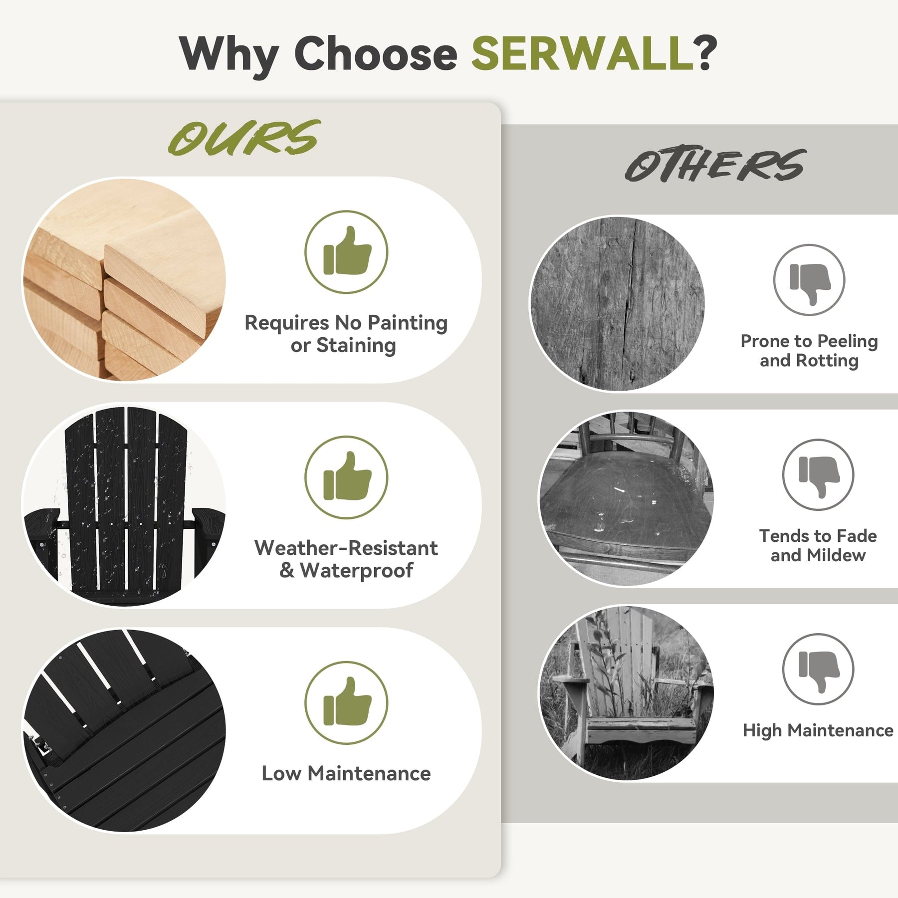 Our outdoor glider chair set is crafted from HDPE(high-density) material,ensuring its sturdiness and durability. it offers exceptional weatherresistance,making it easy to clean and maintain.