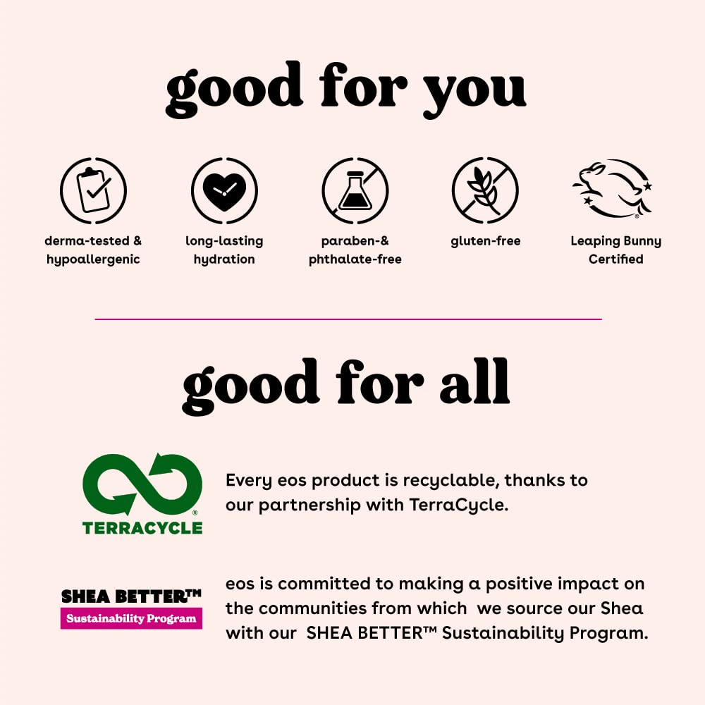 • ALL-NATURAL SHEA BUTTER: eos products have wild grown, sustainably-sourced 100% natural shea butter to make skin feel moisturized, protected and soft. We are paraben, phthalate and gluten free. Dermatologist tested. Vegan. Hypoallergenic. PETA certified. No products tested on animals.