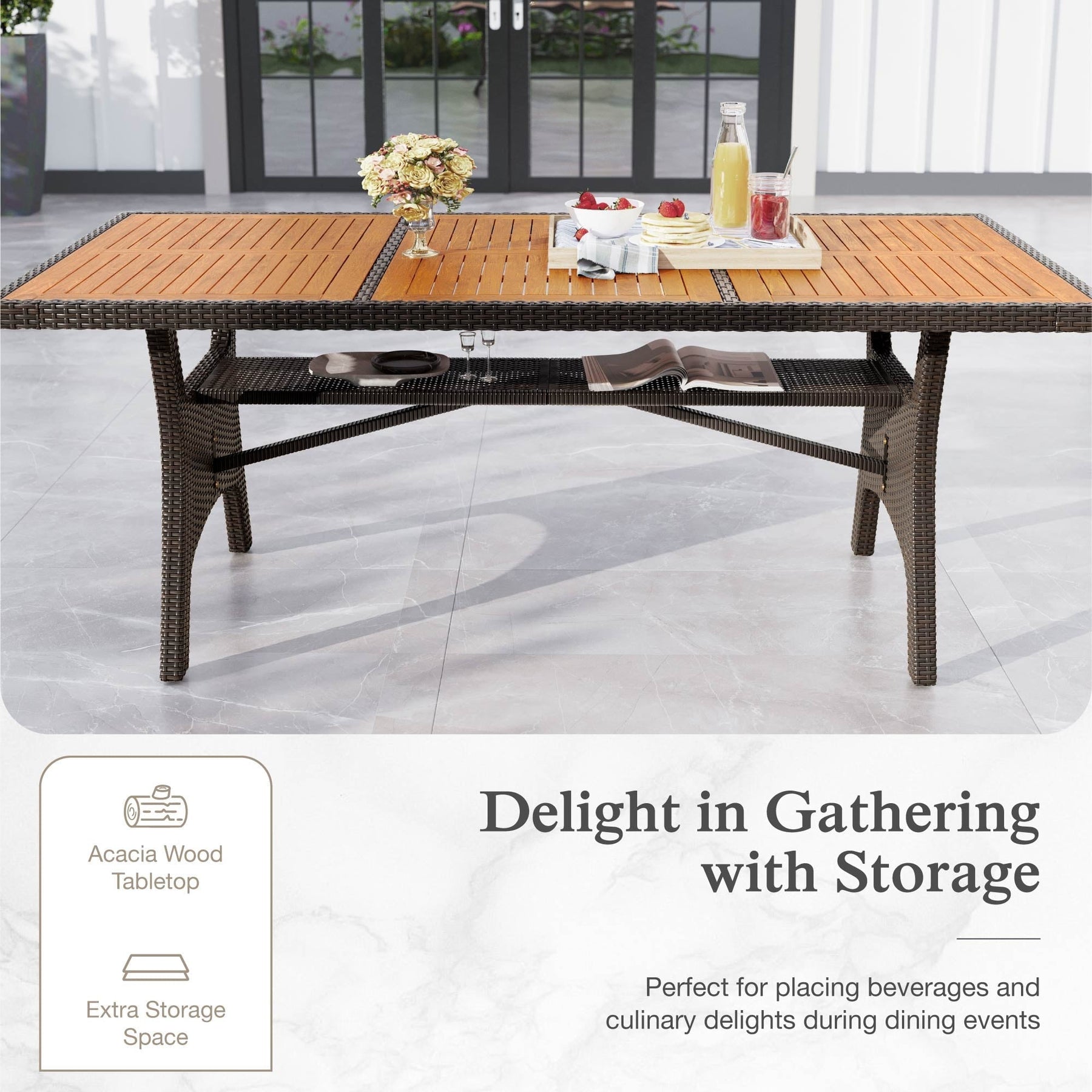 Introducing the Alpha Joy Acacia Wood Patio Dining Table, a perfect blend of style and functionality. This spacious table features a long surface that allows ample space for up to 8 people, making it ideal for family gatherings or dinner parties. With comfortable seating for 6, everyone can enjoy meals together with ease.