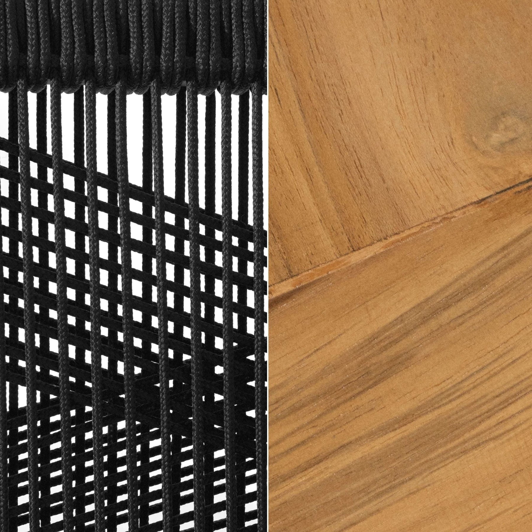 A perfect outdoor lounge chairYour dream summer consists of laying in the sun all day? This teak wood and woven rope lounge chair might be the perfect product for you! Place it outside to create a bohemian environment that inspires both relaxation and luxury. The olefin rope used for the seat and backrest is a premium material for outdoor furniture as it is naturally water, UV and fade resistant. To protect the structure from various weather conditions, the teak wood is coated with a waterproofing product.Choose boho for your patioMade of a judicious mix of natural materials, this lounge chair seduces by its artisanal aspect. With it, you can easily create a lounge area on your terrace, patio or in your garden. Over time, you may notice a slight variation in the color of the wood. This is perfectly normal and is what makes your chair unique!