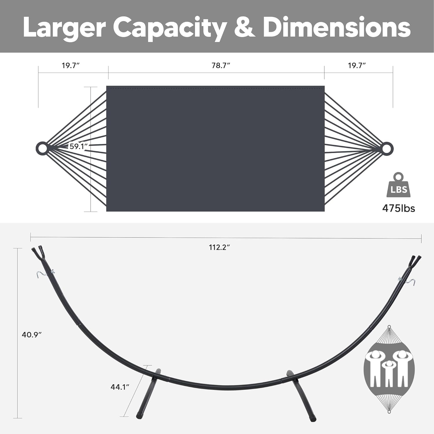 - Stable Hammock Frame: SUNCREAT heavy duty hammock stand is made of high-quality widened steel tubes, with non-slip plastic protector on the bottom, making it more sturdy. The metal hammock stand holds up to 475 pounds. It can accommodate 2-3 people at once. And the elegant curves can well decorate your backyard