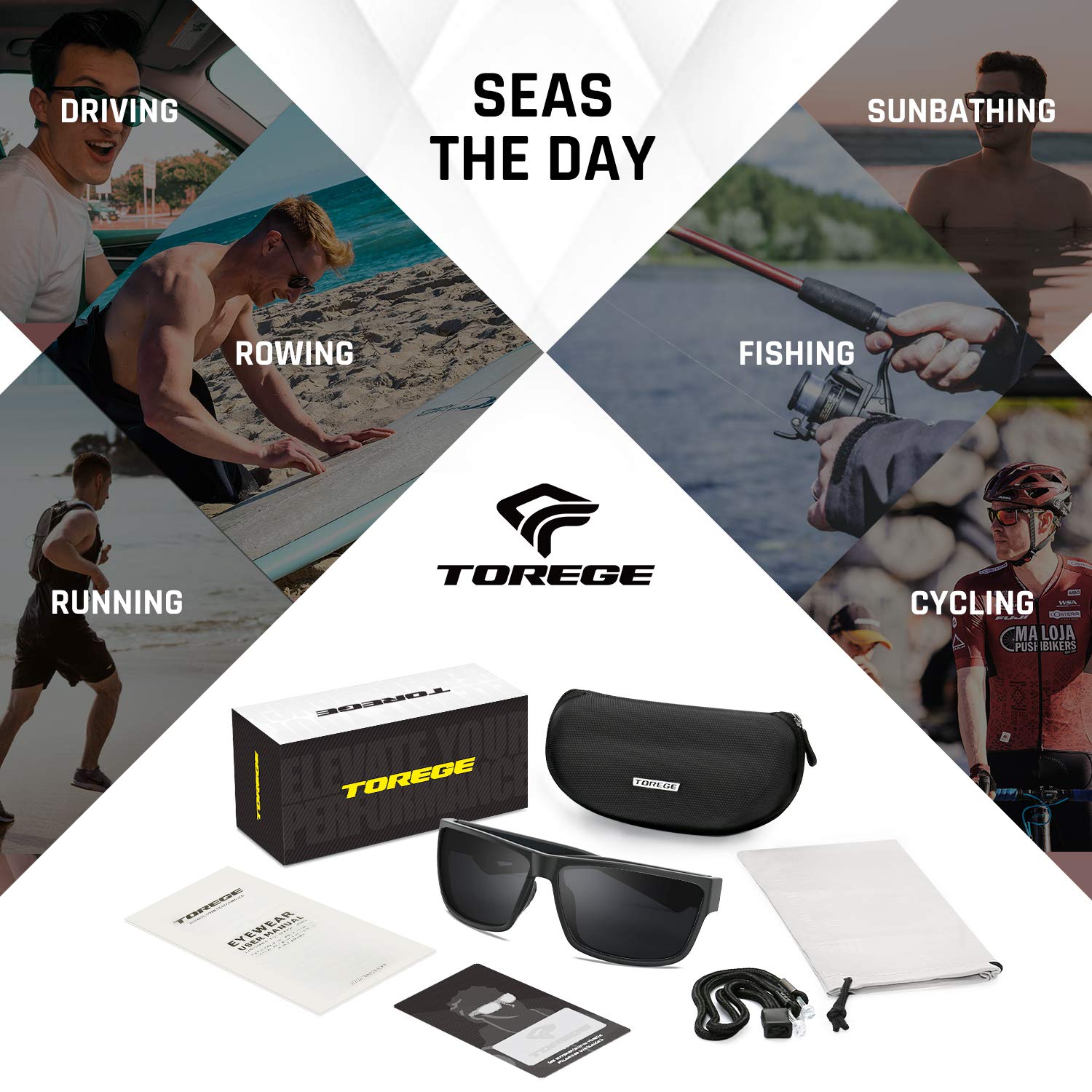 • TOREGE FRAME TECHNOLOGY -TOREGE sunglass frames are lightweight, extremely flexible, and heat and UV resistant.Durbility and lightweight TR90 frame with no-slip nose pad and temple increase grip with perspiration to offering all day comfortable fit.Spring hinges are adjustable and suitable for medium to large faces.Ergonomic design fits many face shapes comfortably and all sporty event.