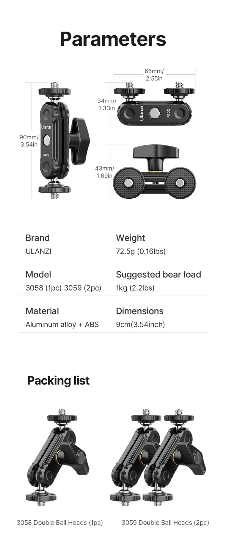 Model Number: R098 Double Ball Heads with Cold Shoe Mount