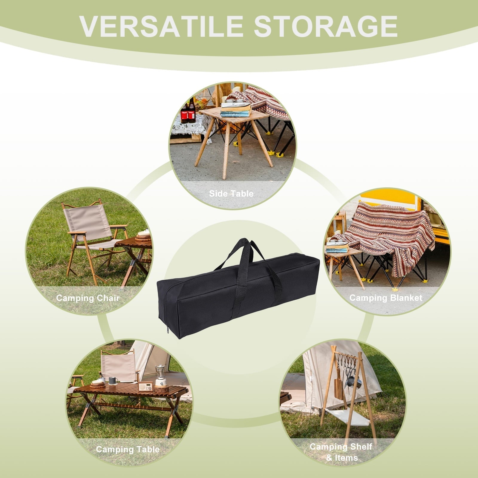 Designed for convenience, this camping chair bag accommodates folded items like small chairs, yoga mats, blankets, umbrellas, tripods, monopods, and light stands, etc. Whether you are camping, traveling, hiking, or enjoying the outdoors, it keeps your gear organized and portable.